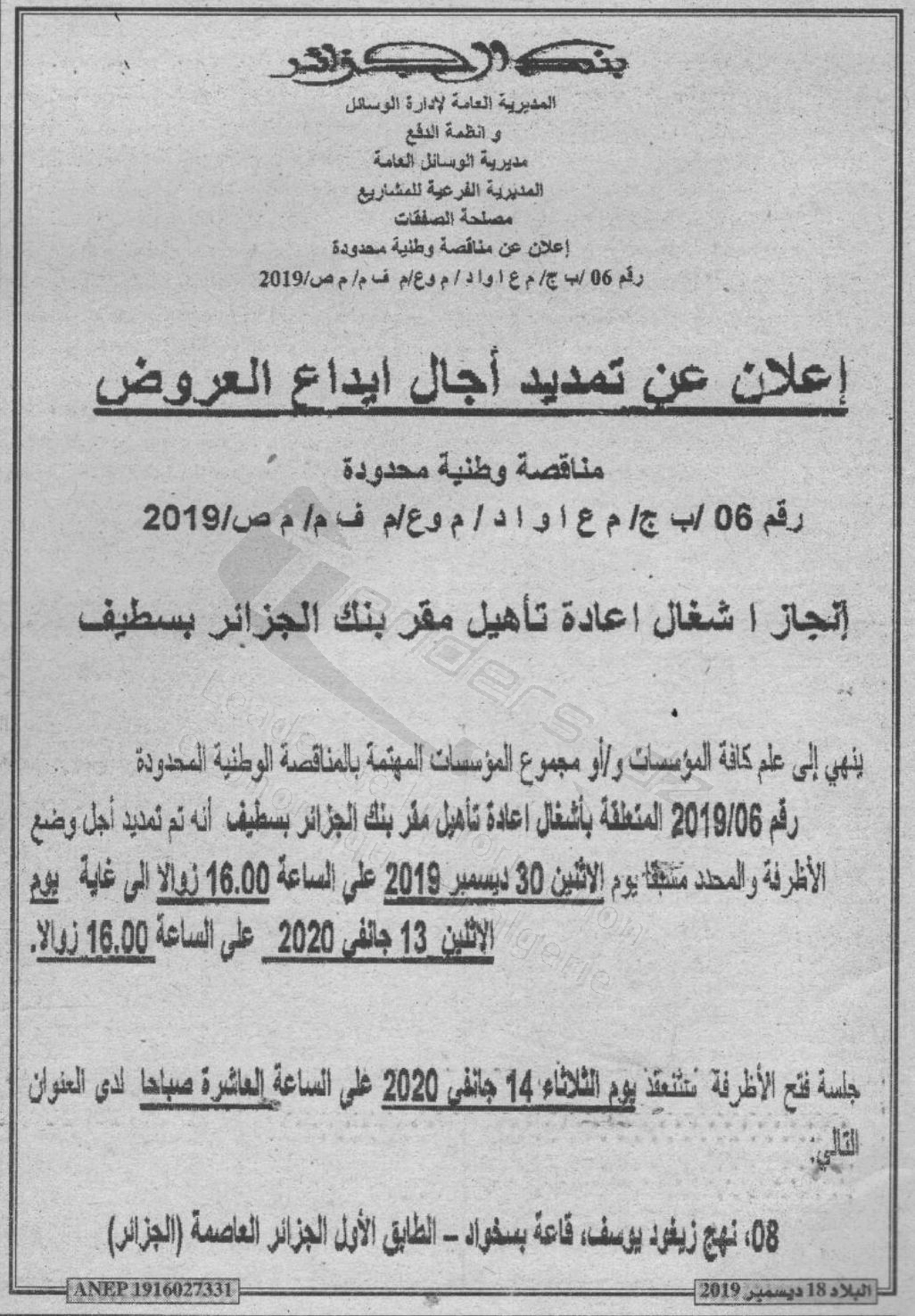AVIS Attribution :  Réalisation des travaux de réhabilitation d'un siège de la banque d’Algérie à Setif