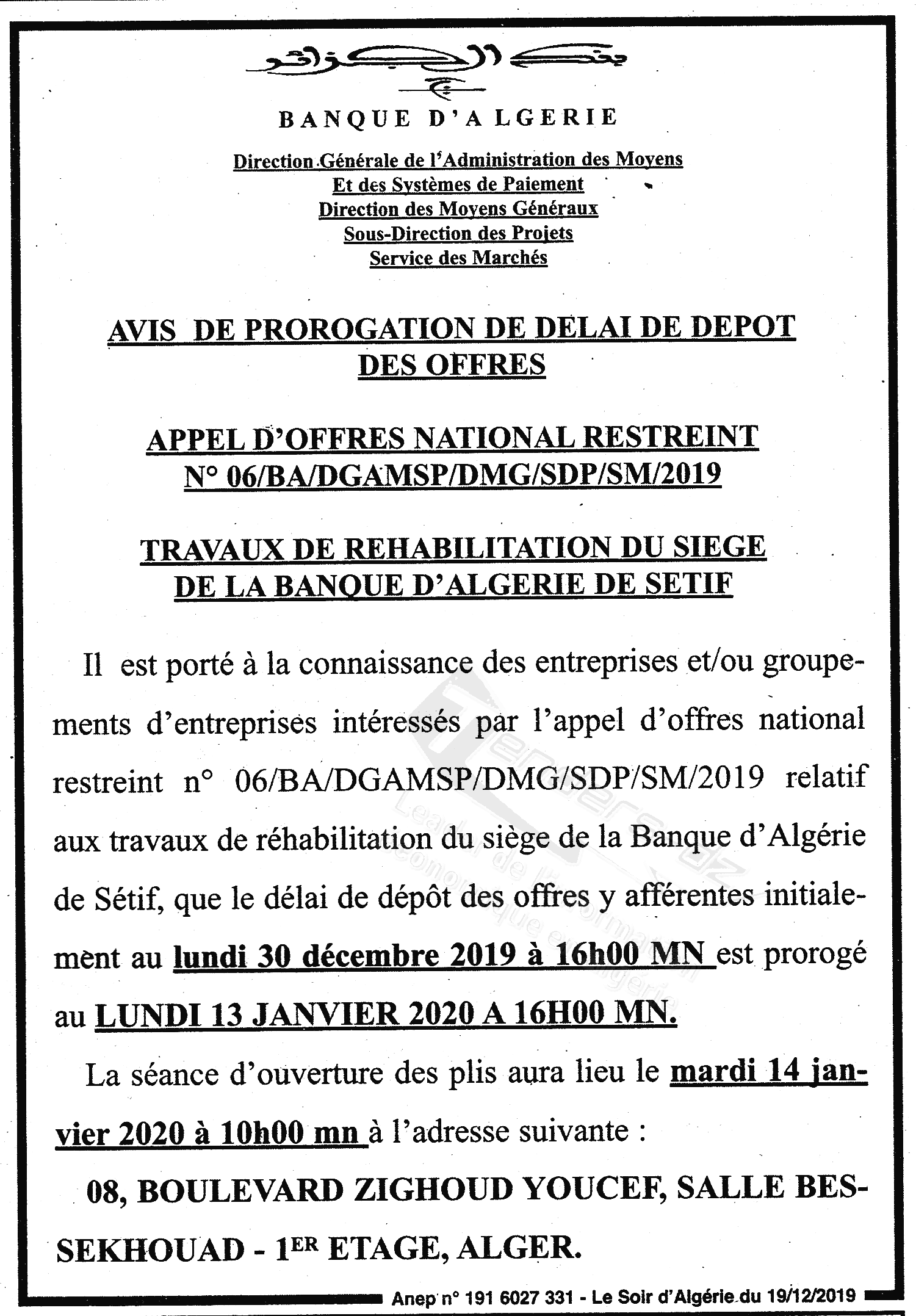 Objet : Réalisation des travaux de réhabilitation d'un siège de la banque d’Algérie à Setif