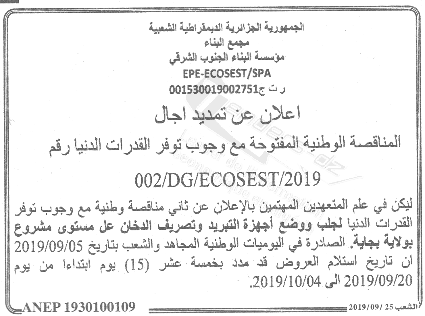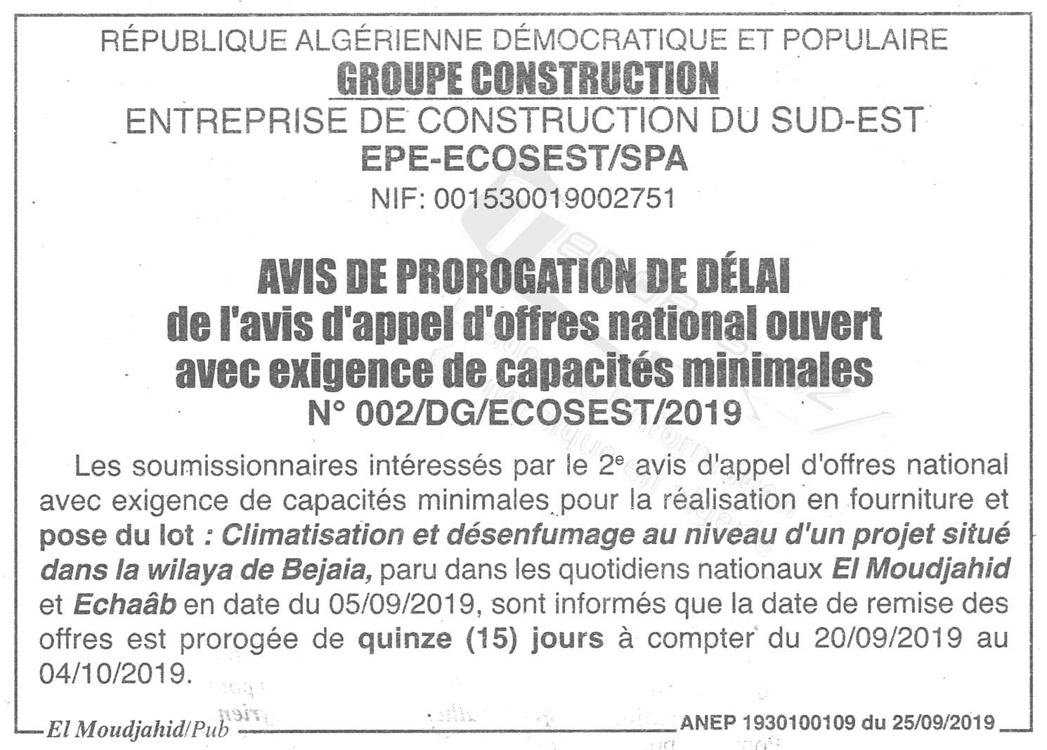 | Montant de Retrait du Cahier de Charges : 5000.00 DA |