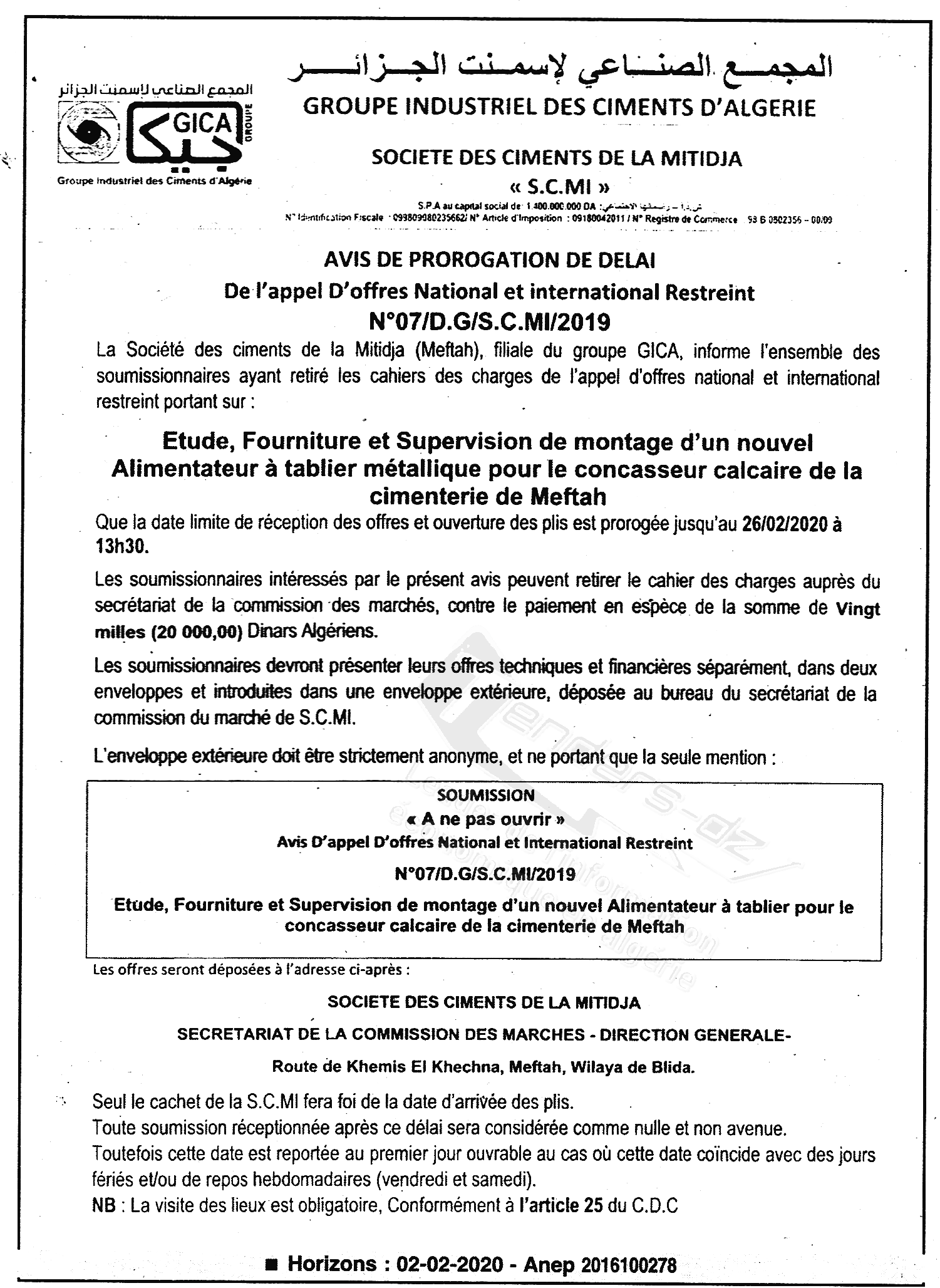 Objet : Etude, fourniture et supervision de montage d'un nouvel alimentateur à tablier métallique pour le concasseur calcaire de la cimenterie de Meftah