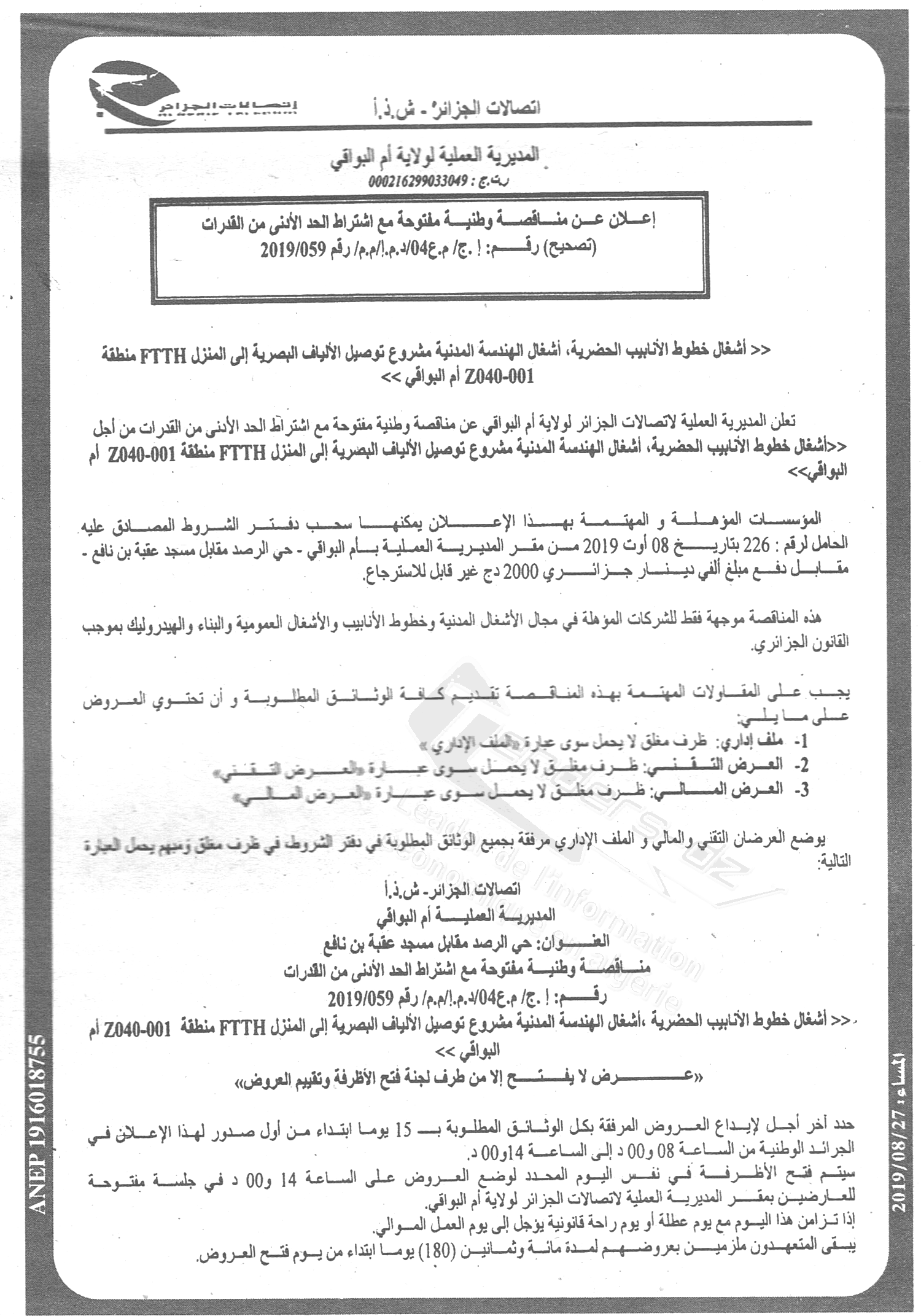 Objet : Travaux de canalisations urbaines, travaux de génie civil projet raccordement des fibres optiques au maison FTTH zone Z040 - 001 Oum El Bouaghi