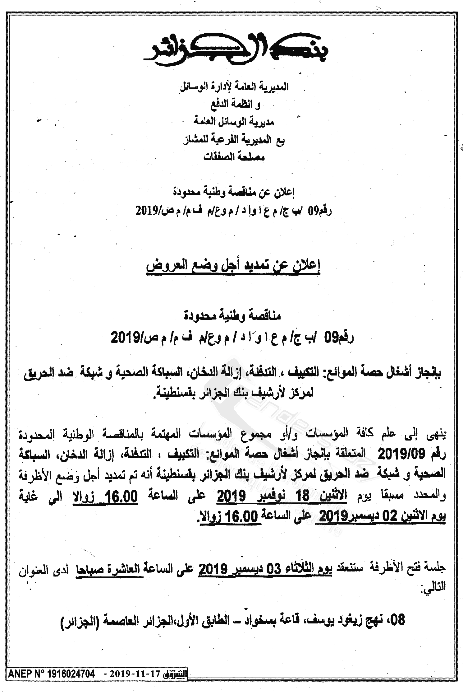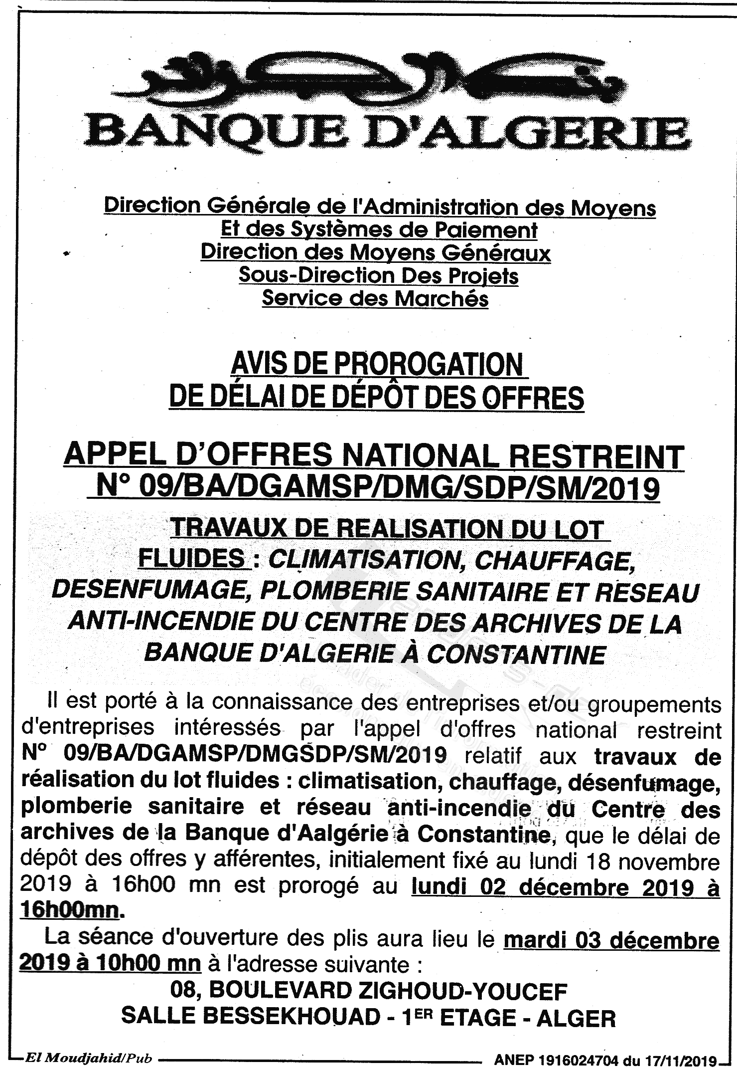Objet : Travaux réalisation du lot fluides , climatisation , chauffage n désenfumage , plomberie sanitaire et réseau Anti incendie du centre des archives de la banque d’Algérie à Constantine