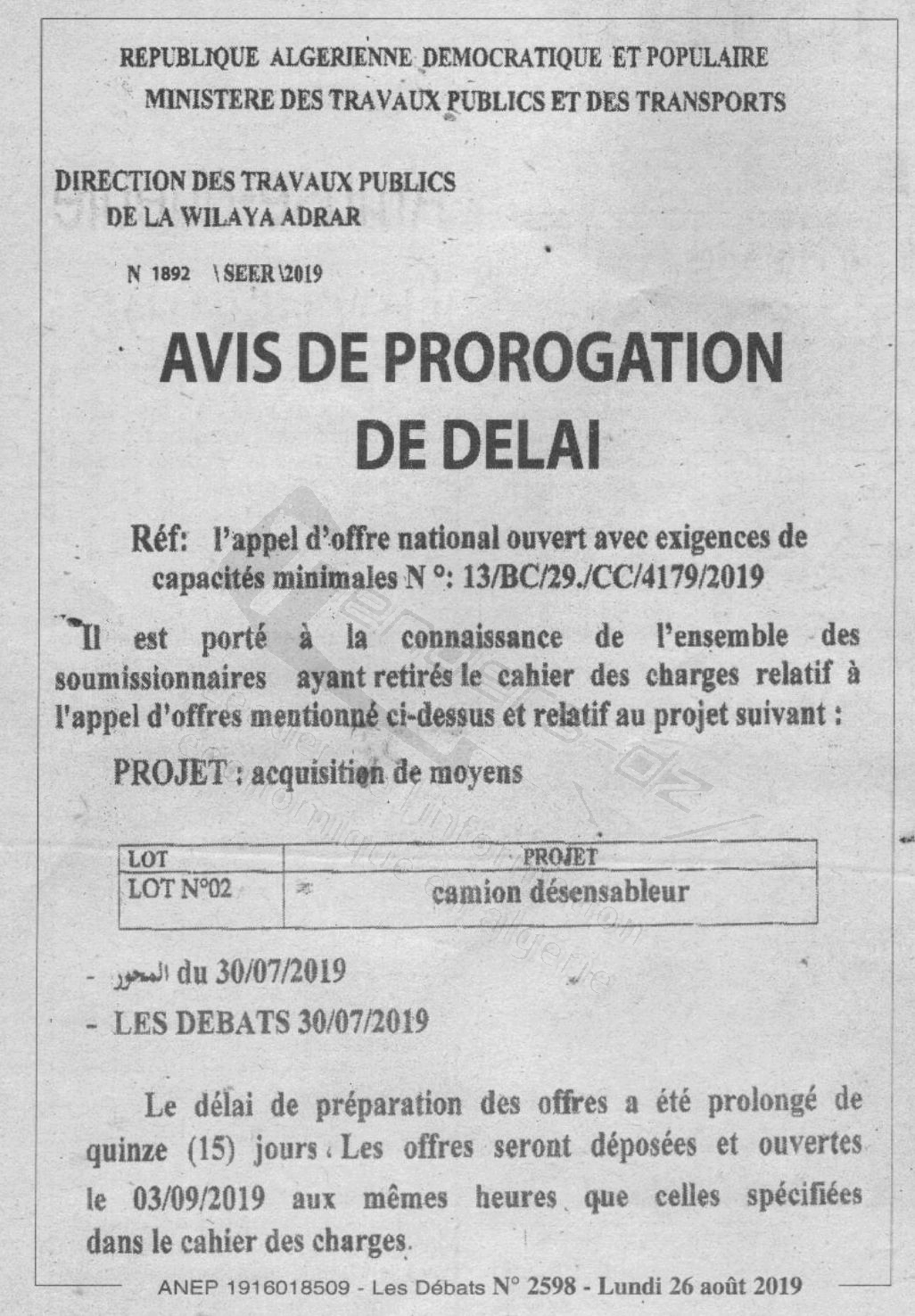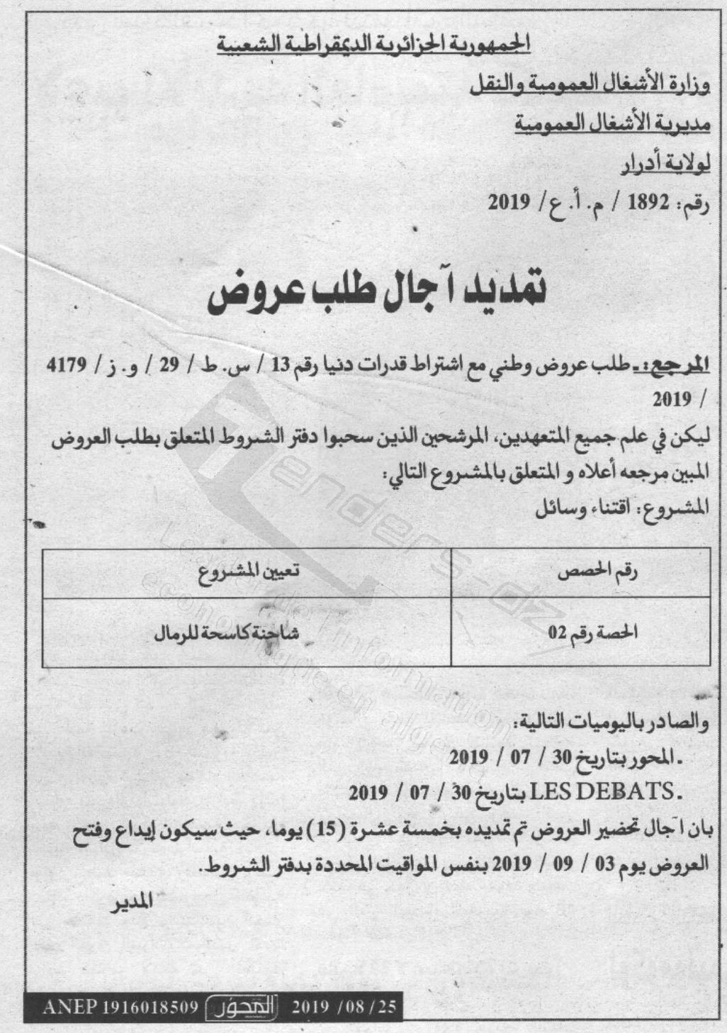 Nom Organisme : DTP WILAYA D'ADRAR (DIRECTION DES TRAVAUX PUBLICS)