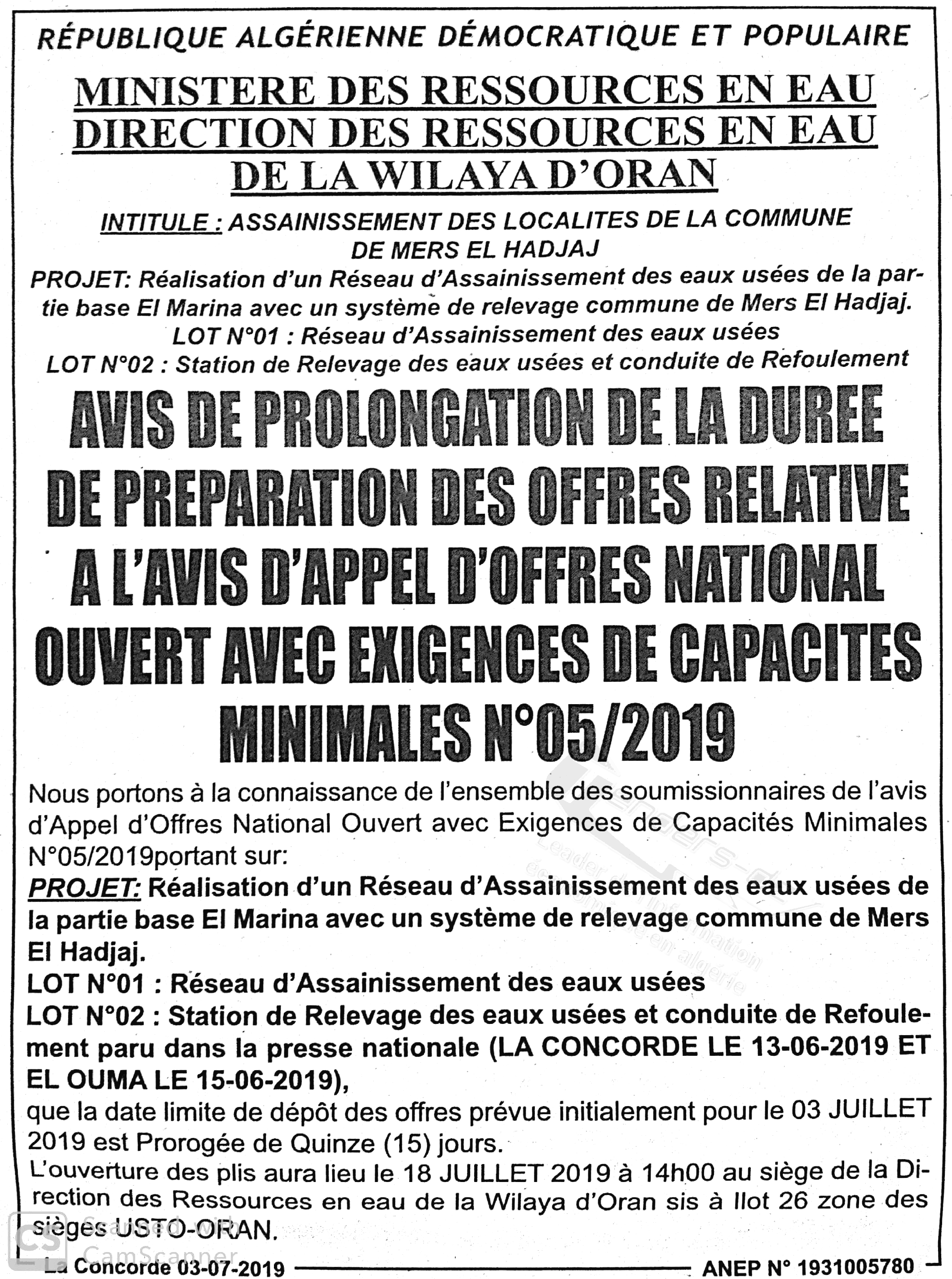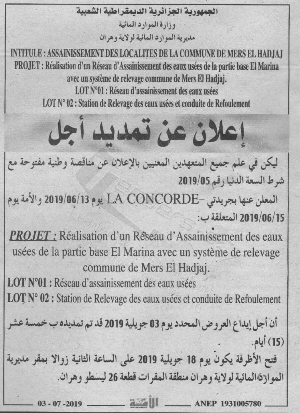 Objet : Réalisation d'un réseau d'assainissement des eaux usées de la partie base El Marina avec un système de relevage en 02 lots