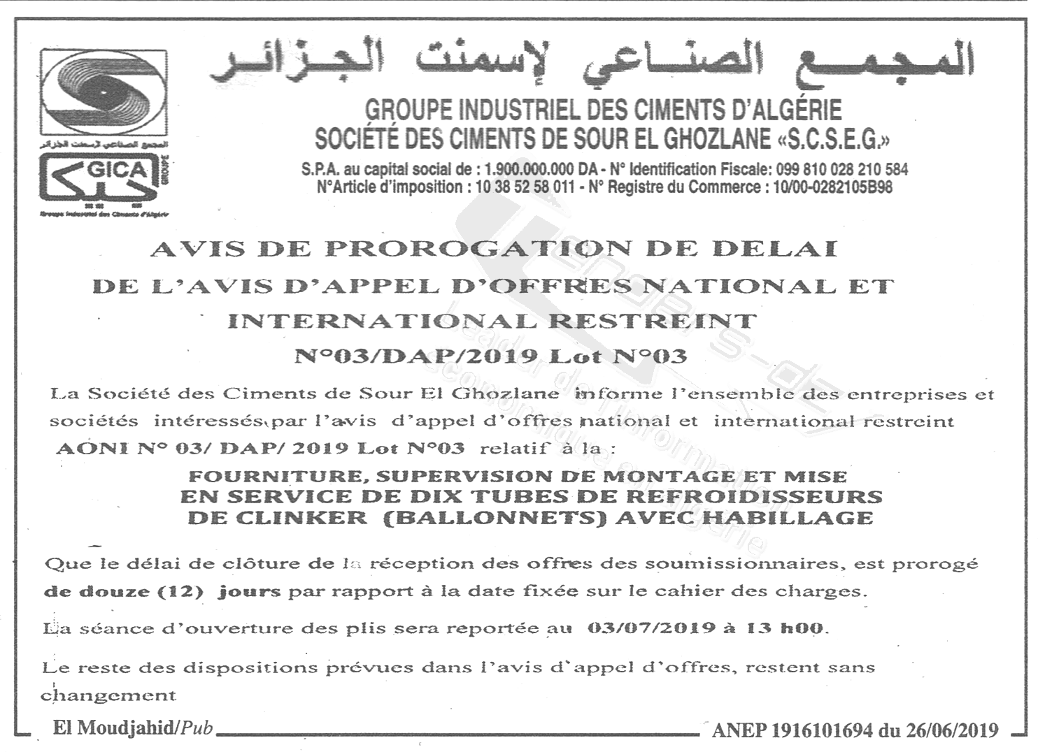 | Montant de Retrait du Cahier de Charges : 1500.00 DA |