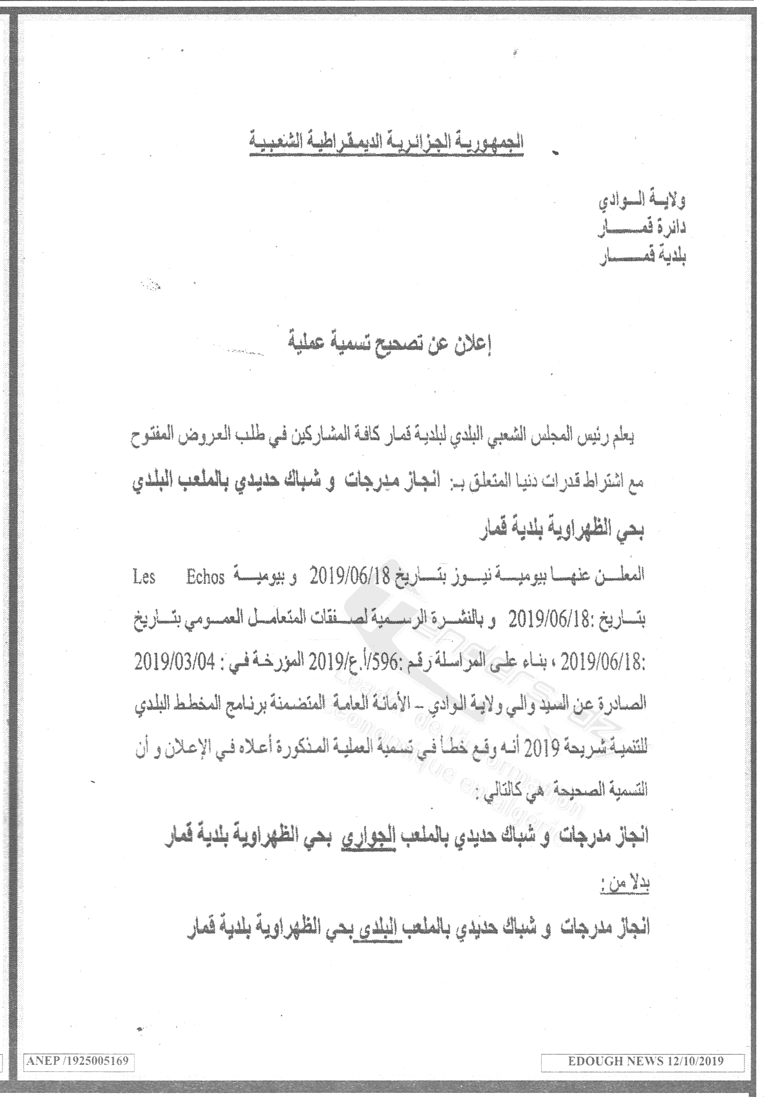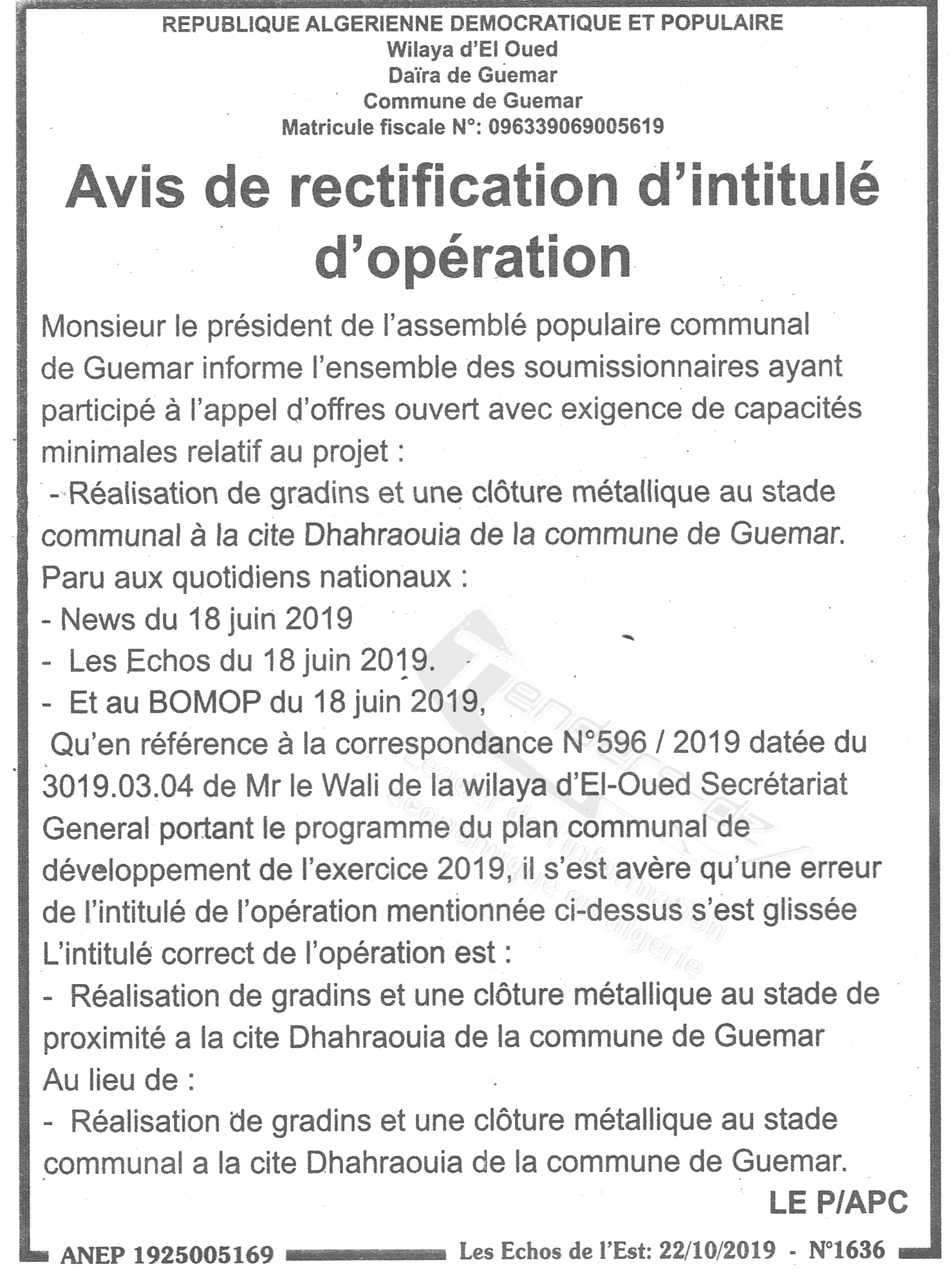 | Montant de Retrait du Cahier de Charges : Non Mentionné |