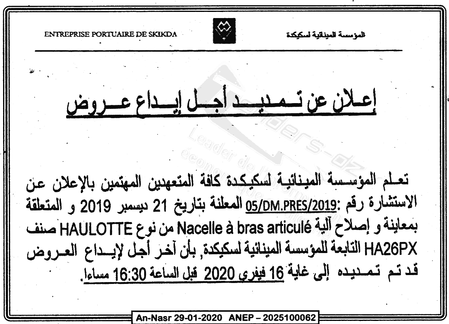 | Montant de Retrait du Cahier de Charges : 500. 00 DA |