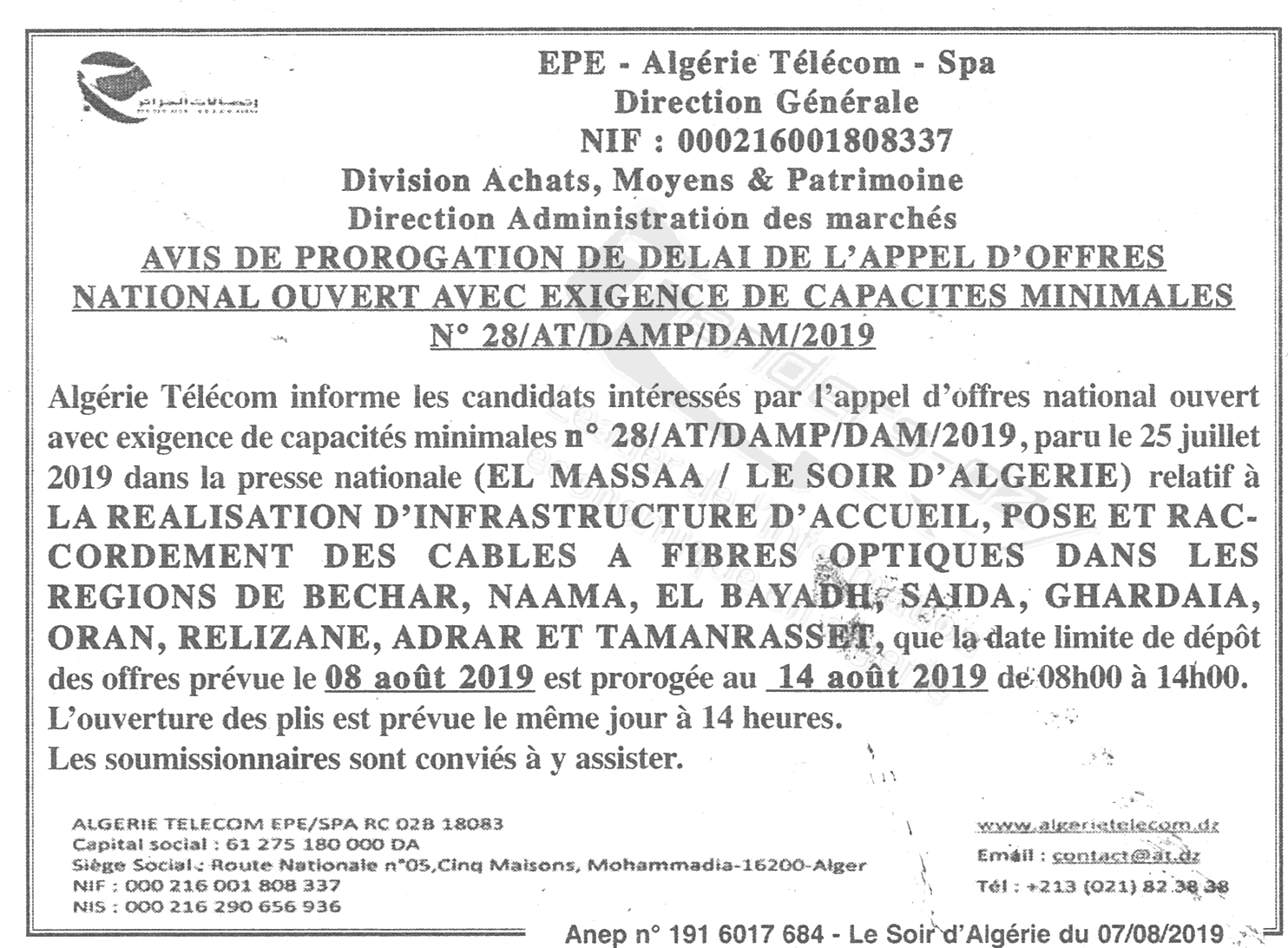 | Montant de Retrait du Cahier de Charges : 5000.00 DA |