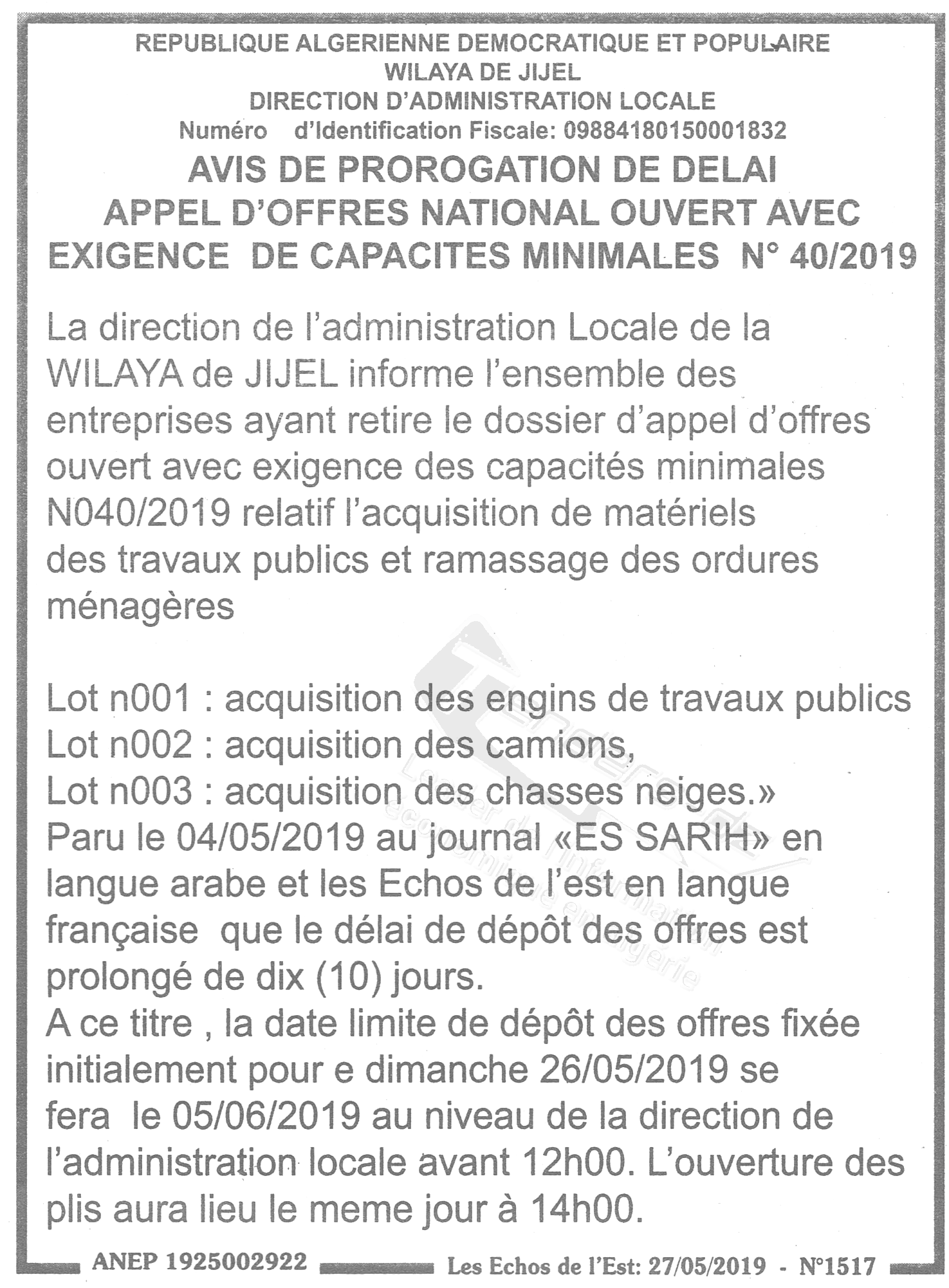 | Montant de Retrait du Cahier de Charges : 3000 DA |