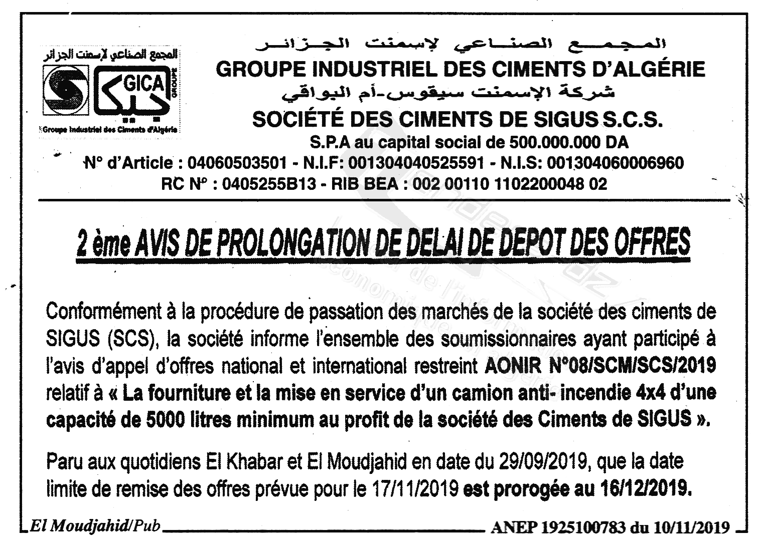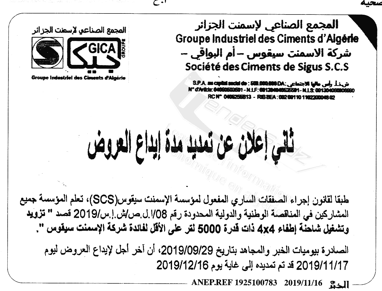 | Montant de Retrait du Cahier de Charges : 20.000.00 DA |