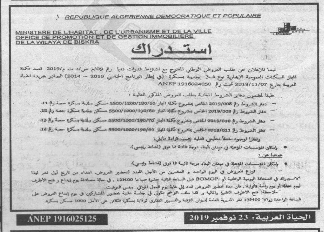 Objet : Achèvement de réalisation des LPL type F3 commune de Biskra en lots