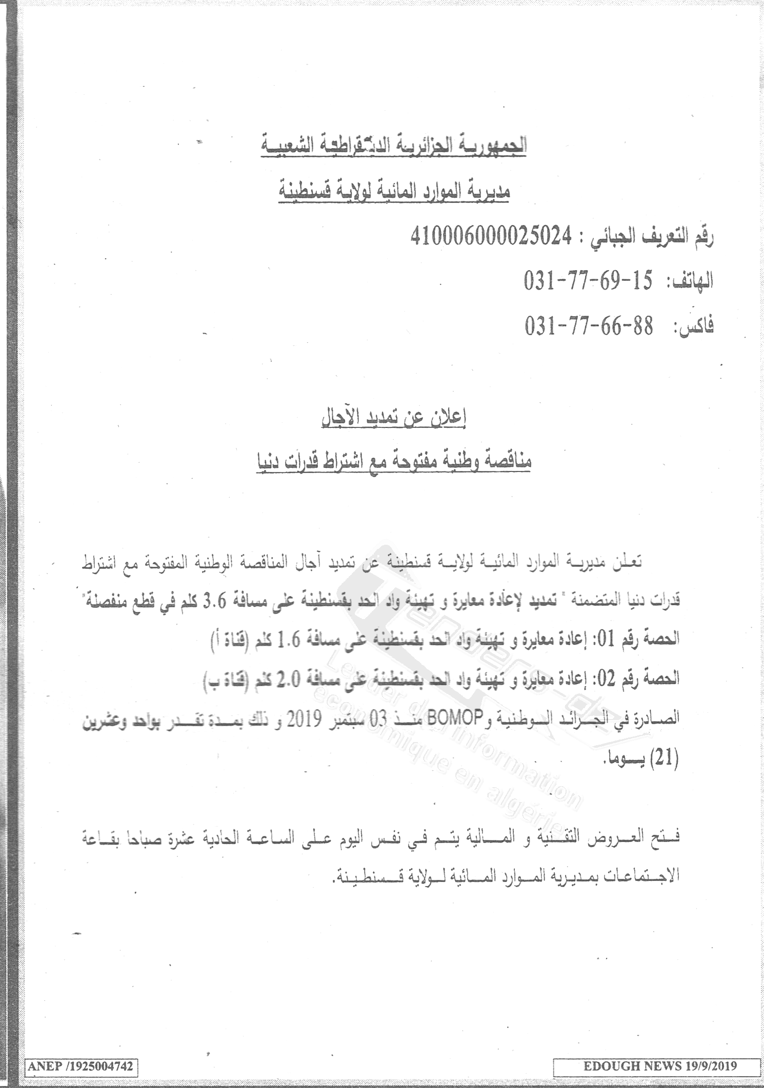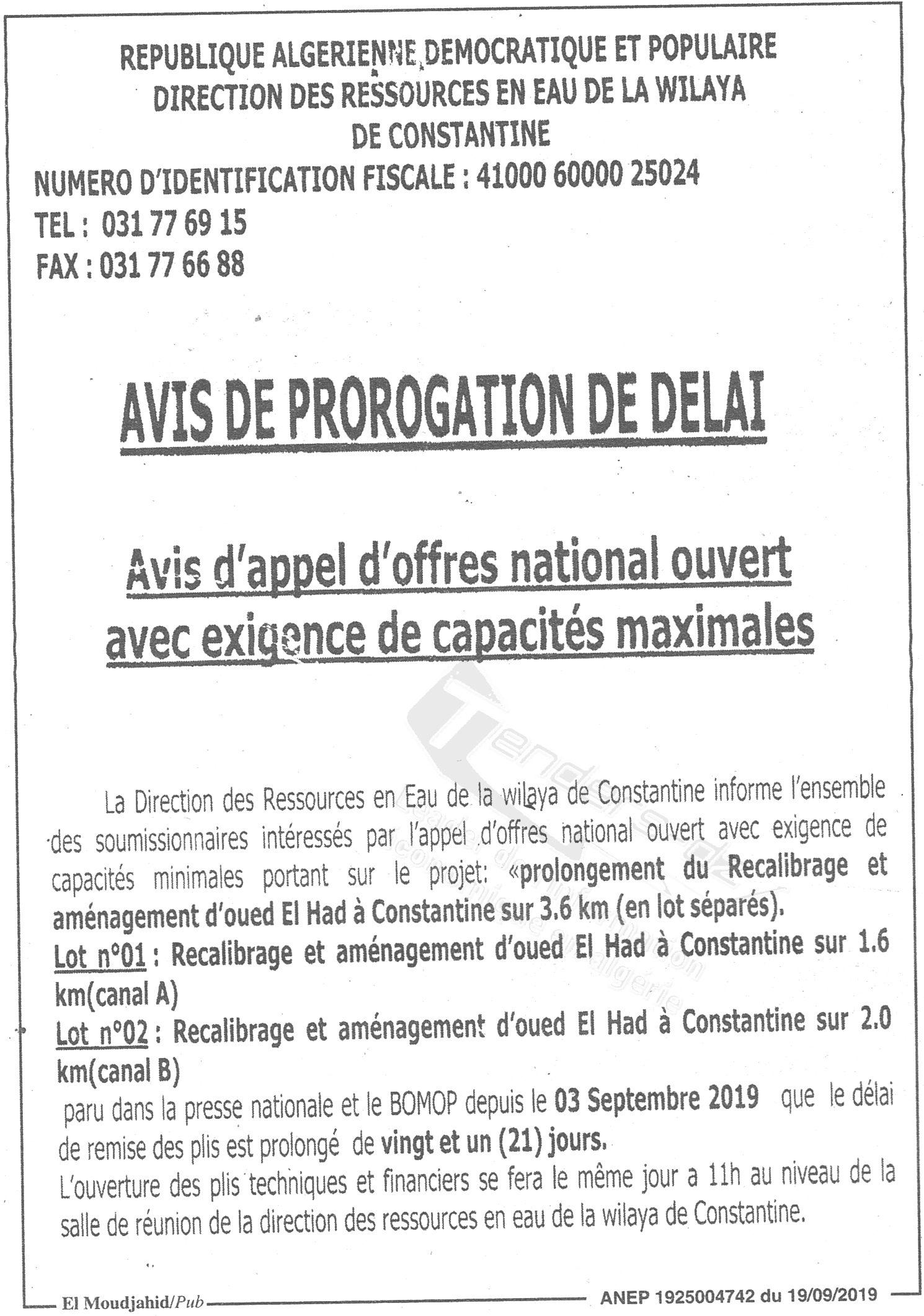Objet : Extension et aménagement Oued El Had à Constantine sur distance de 3.6 Km en Lots séparés