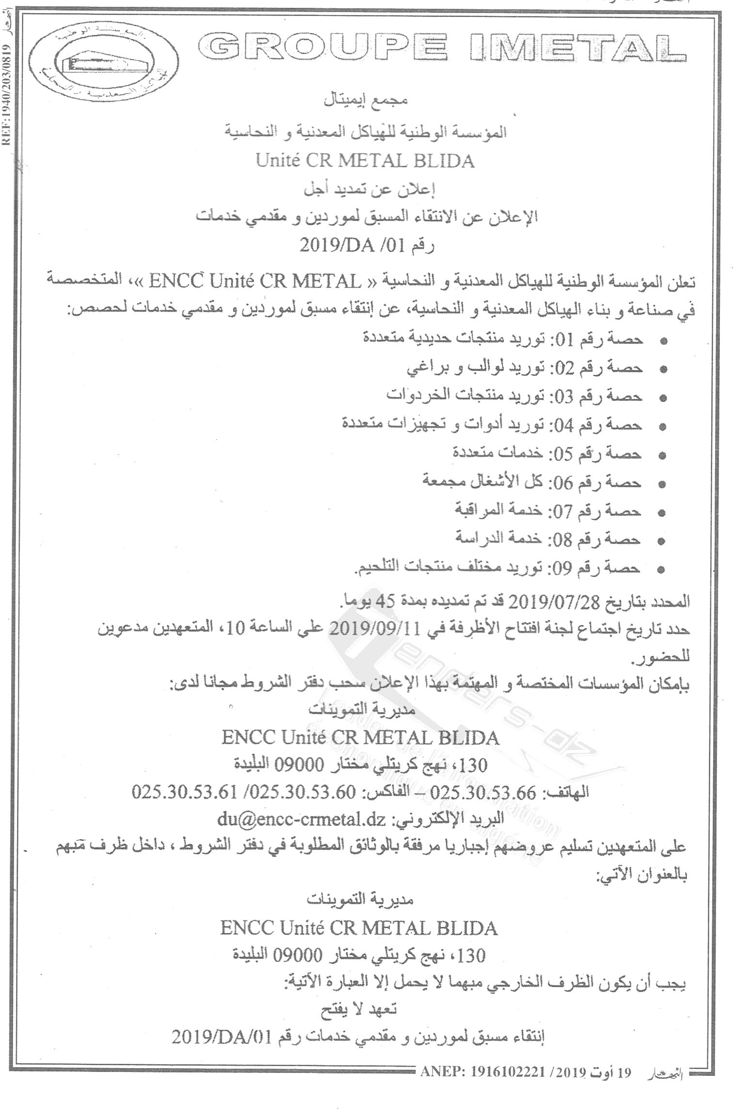 Email : crmetal@encc-dz.com Site Web : www.encc-dz.com