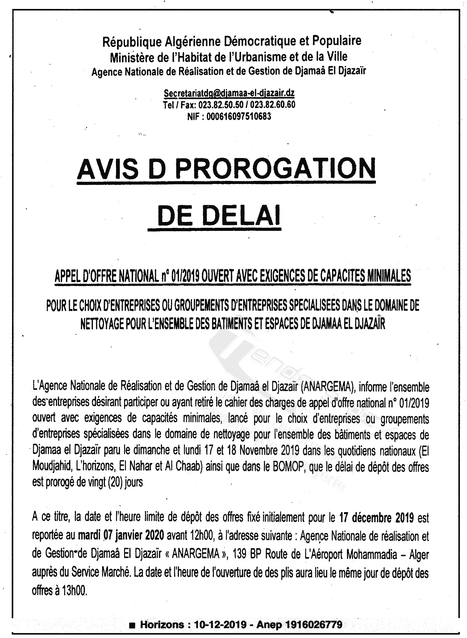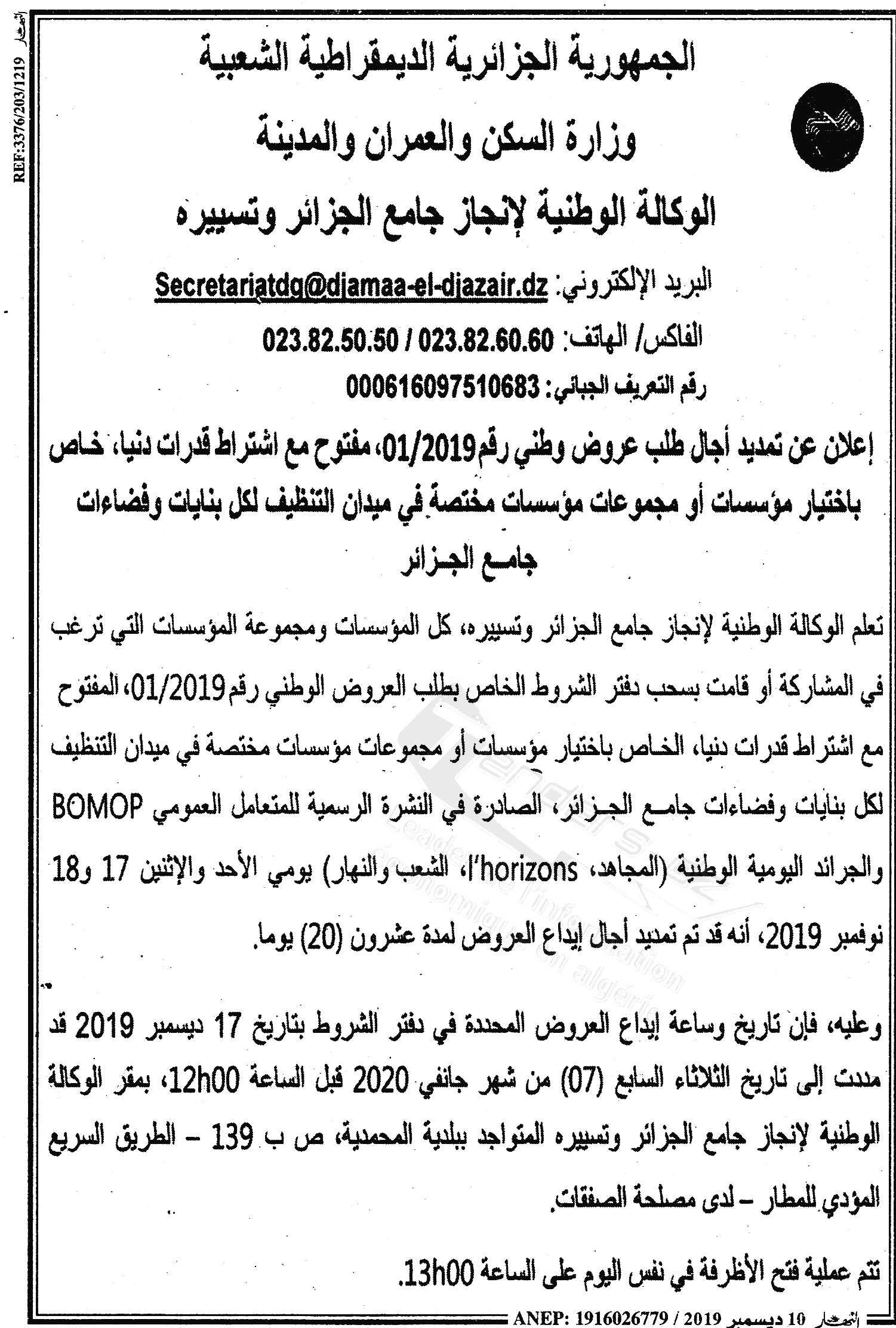 Objet : Choix d'entreprises ou groupements d’entreprise spécialisées dans le domaine d'entretien et de nettoyage de l'ensemble des bâtiments et espaces de Djarmaa El Djazair