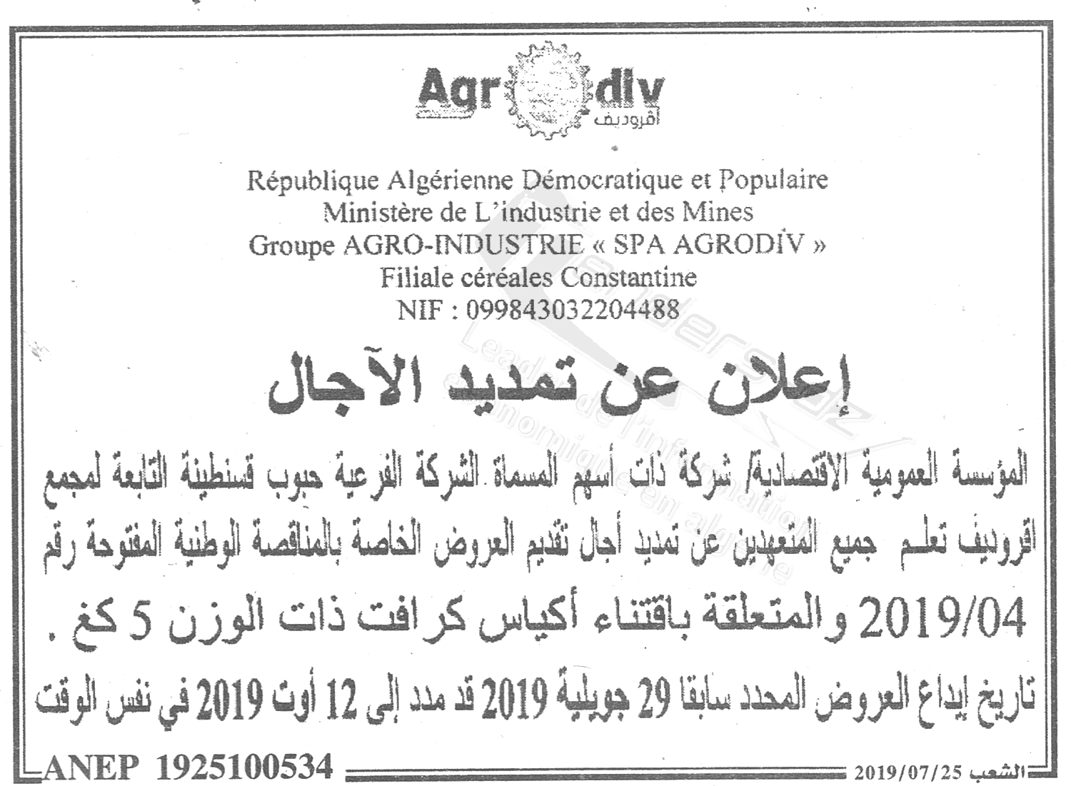 Nom Organisme : AGRODIV/ FILIALE CEREALES CONSTANTINE