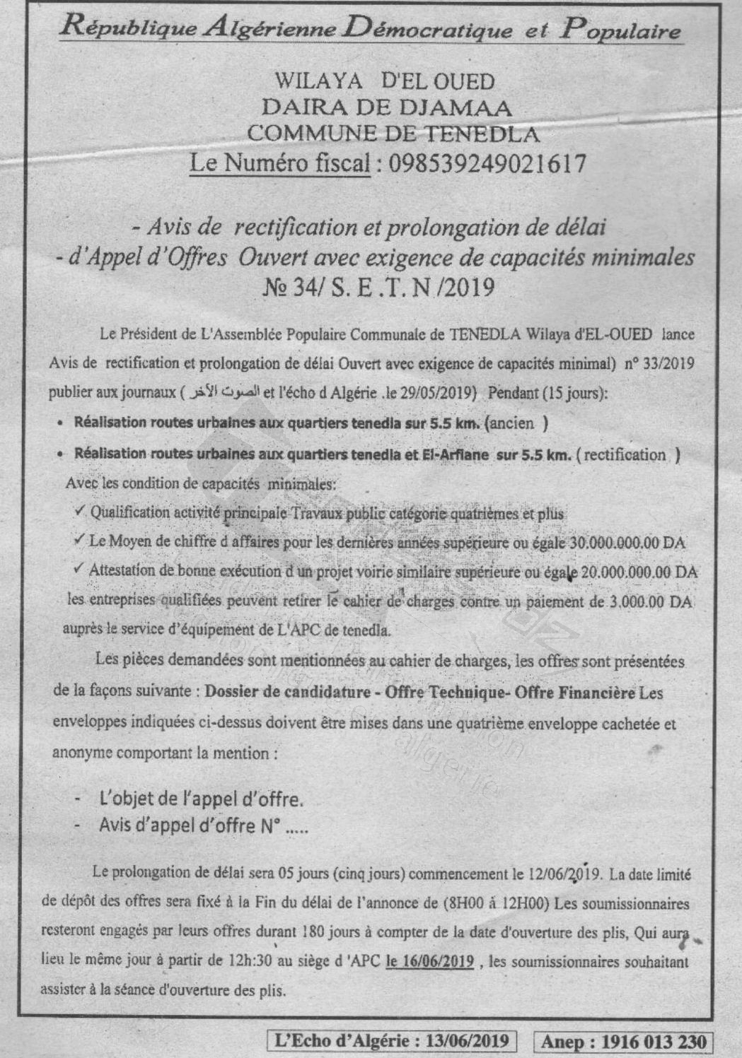 Objet : Réalisation routes urbaines aux quartiers Tenedla et El Agfian sur 5.5 Km