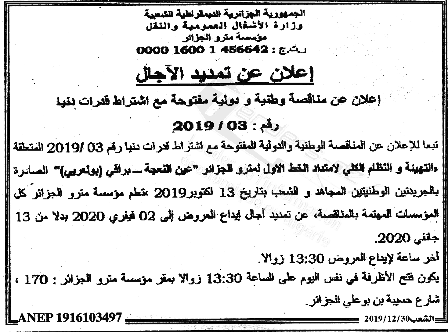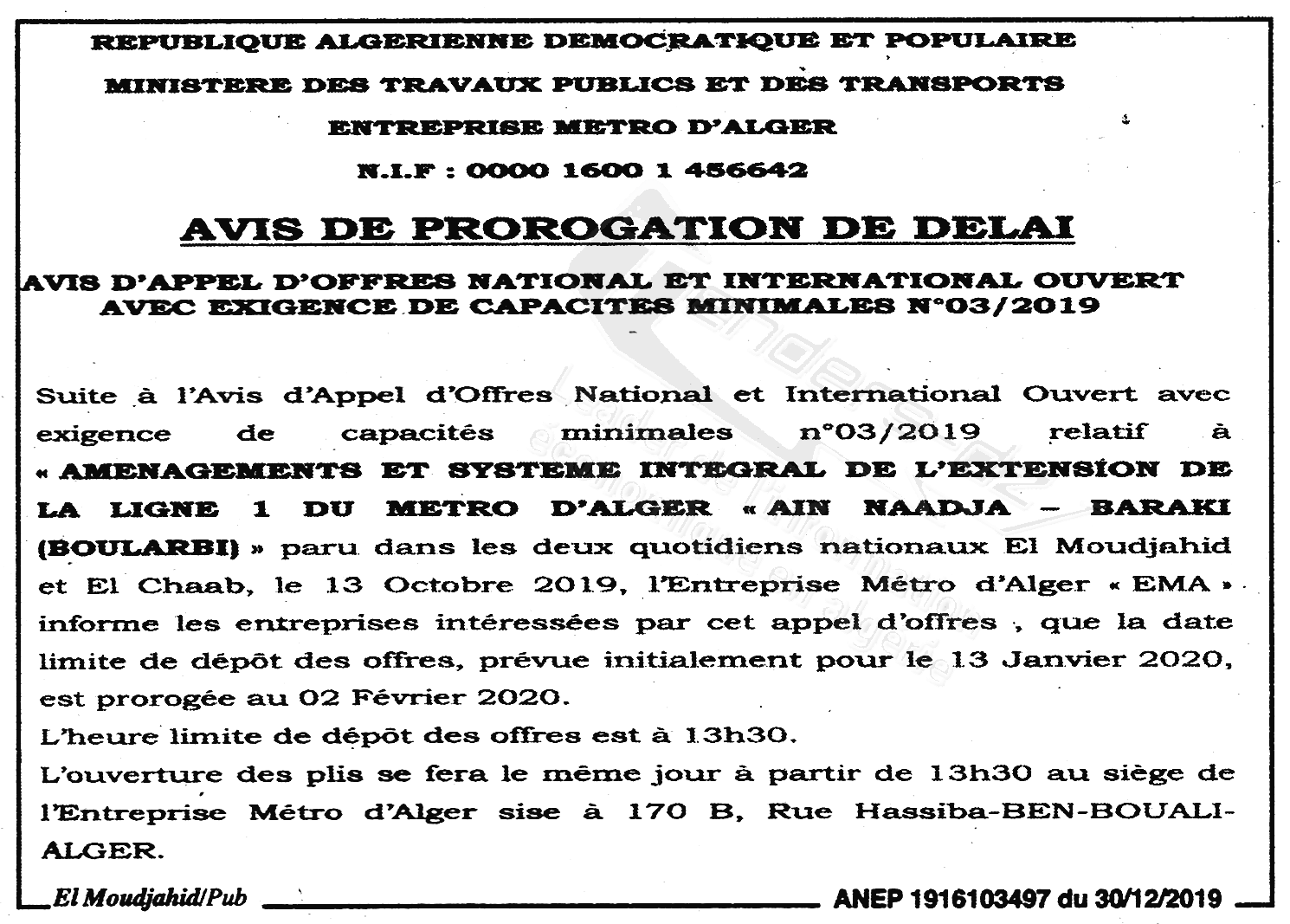 Objet : Aménagement et système intégral de l'extension de la ligne 1 du métro d'Alger