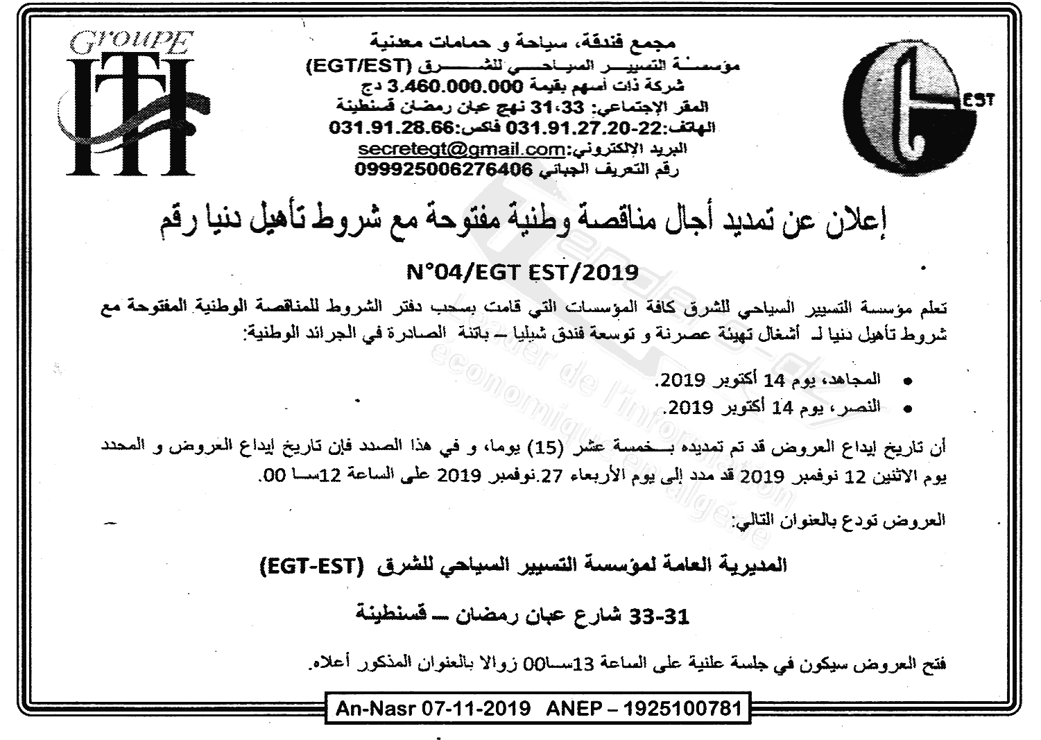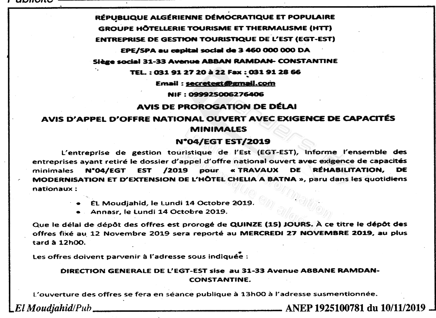 Objet : Réalisation des travaux de réhabilitation , de modernisation et d'extension de l'Hotel Chelia à Batna