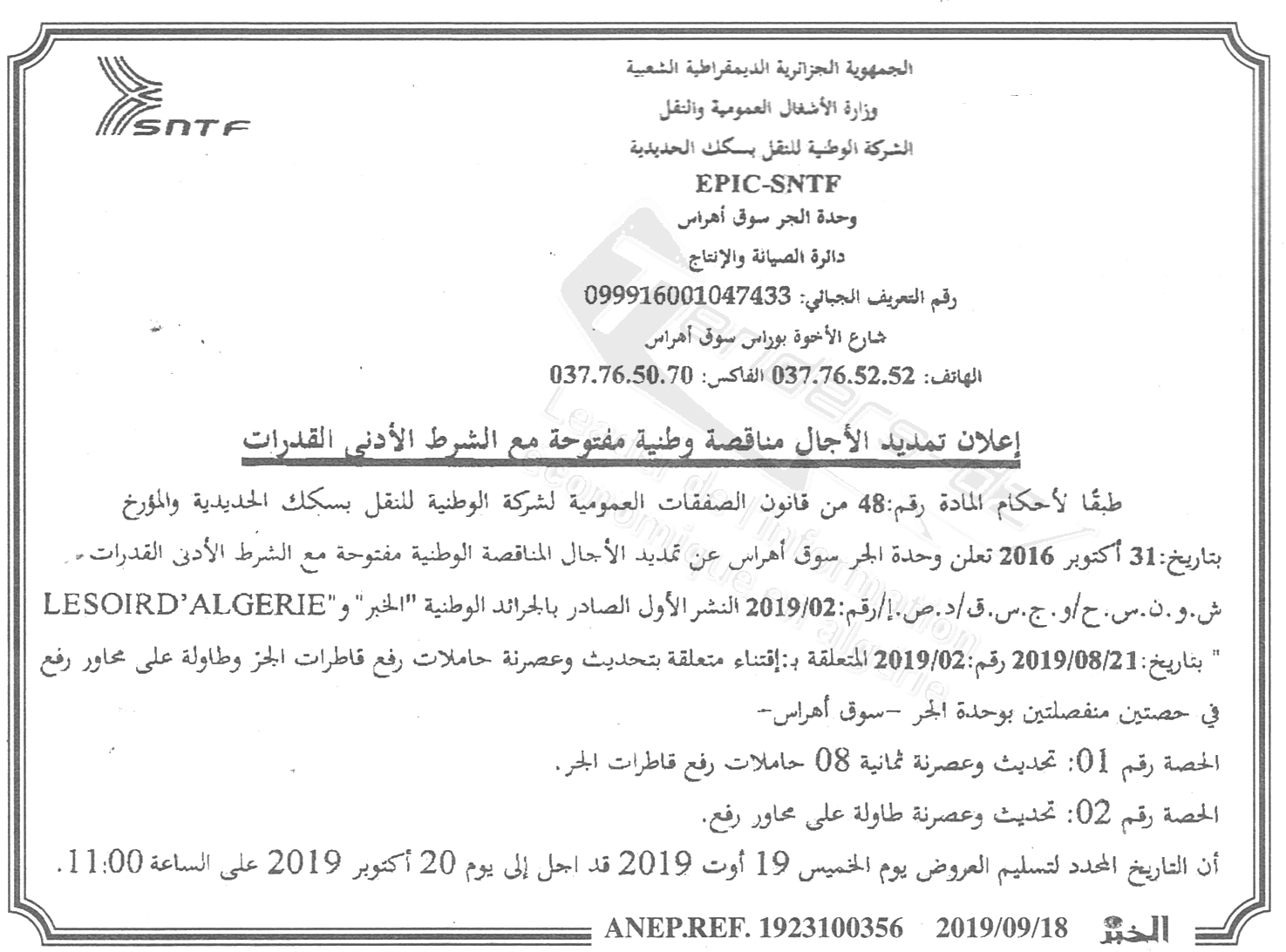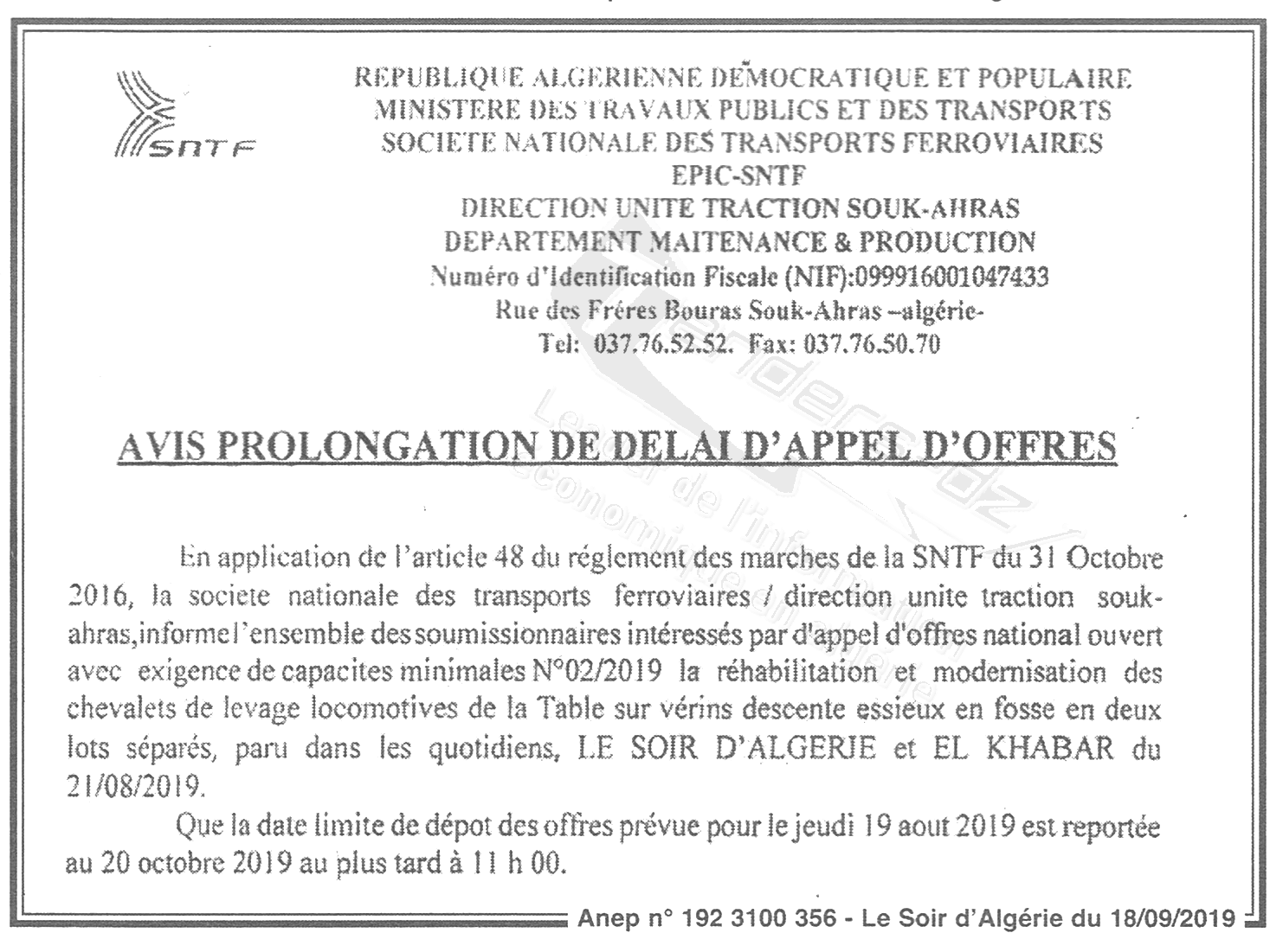 AVIS Infructuosite :  Réhabilitation et modernisation des chevalets de levage locomotives de la table sur vérins descent essieux en fasse en 02 lots