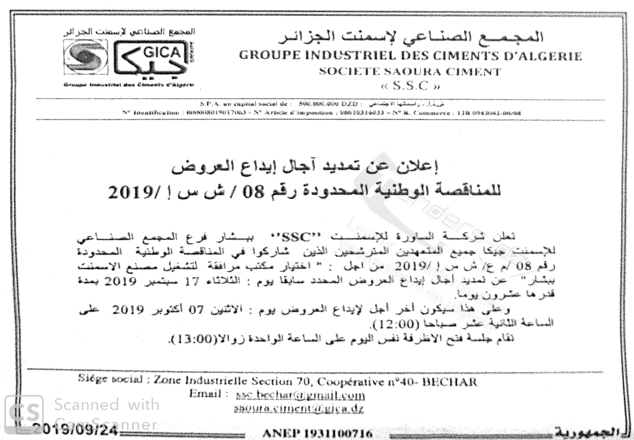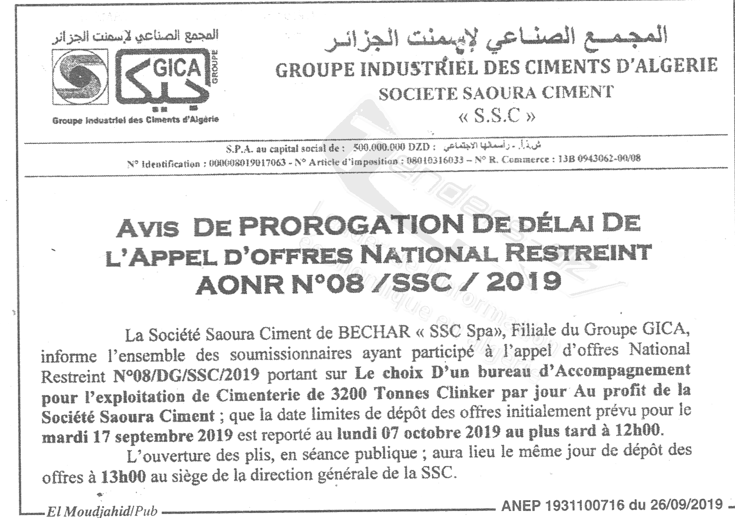 Nom Organisme : SSC DE BECHAR (SOCIETE SAOURA CIMENTS)