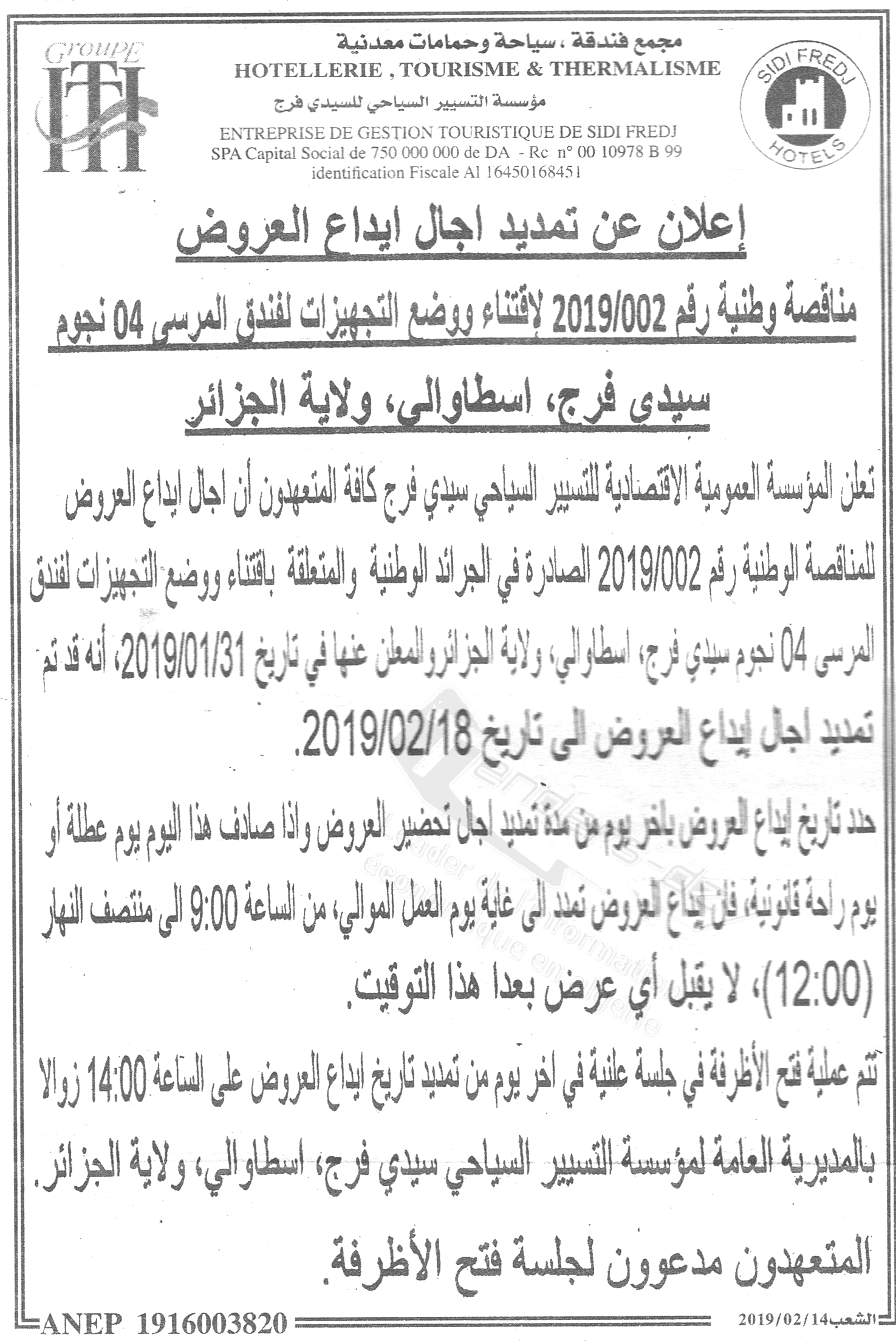 Objet : Fourniture et pose des équipements de l’hôtel El -Marsa 04 étoiles Sidi - Fredj - Staoueli wilaya d'Alger