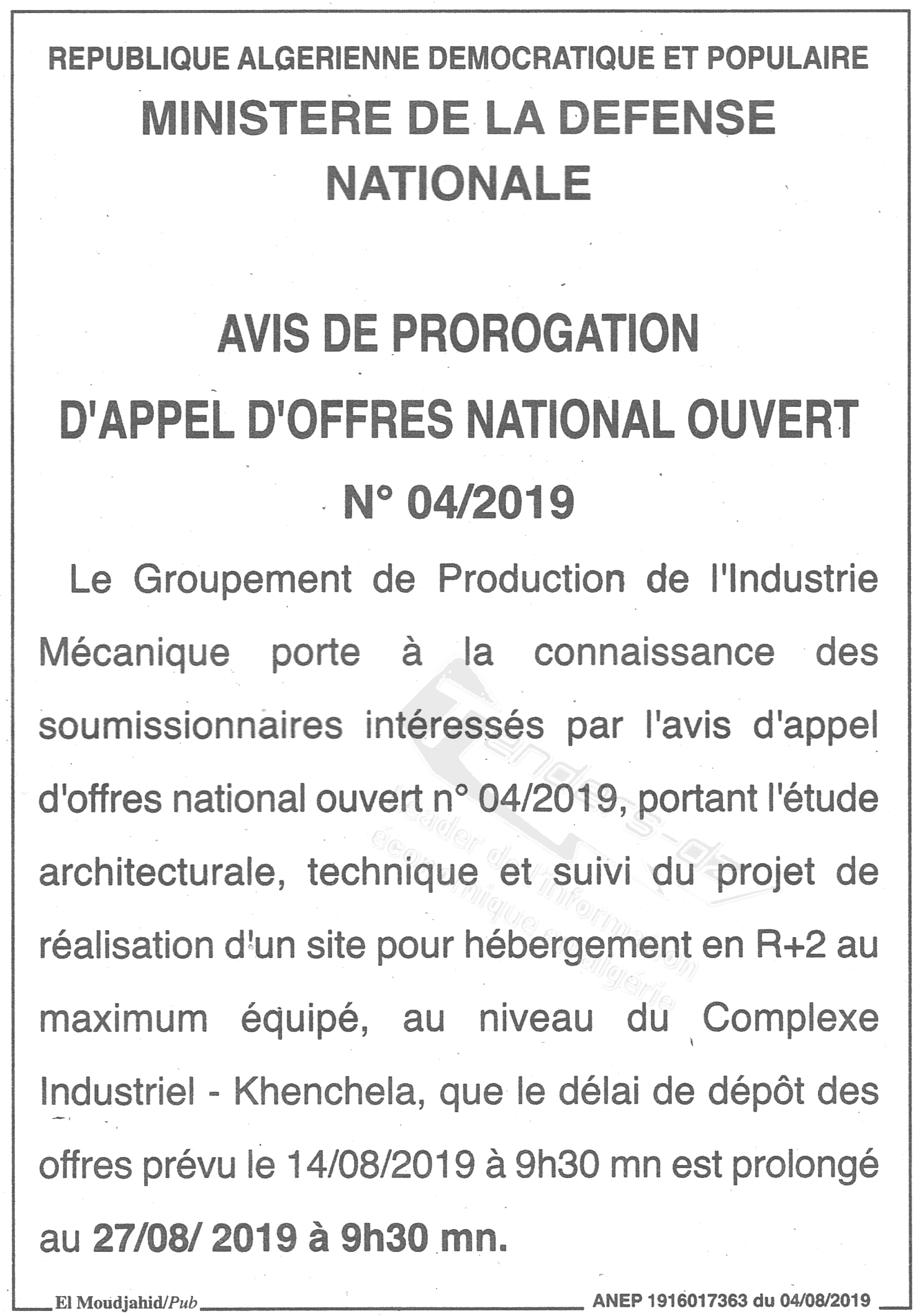 Objet : Etude architecturale , technique et suivi du projet de réalisation d'un hôtel équipé en R+2 au niveau du complexe industriel Khenchela