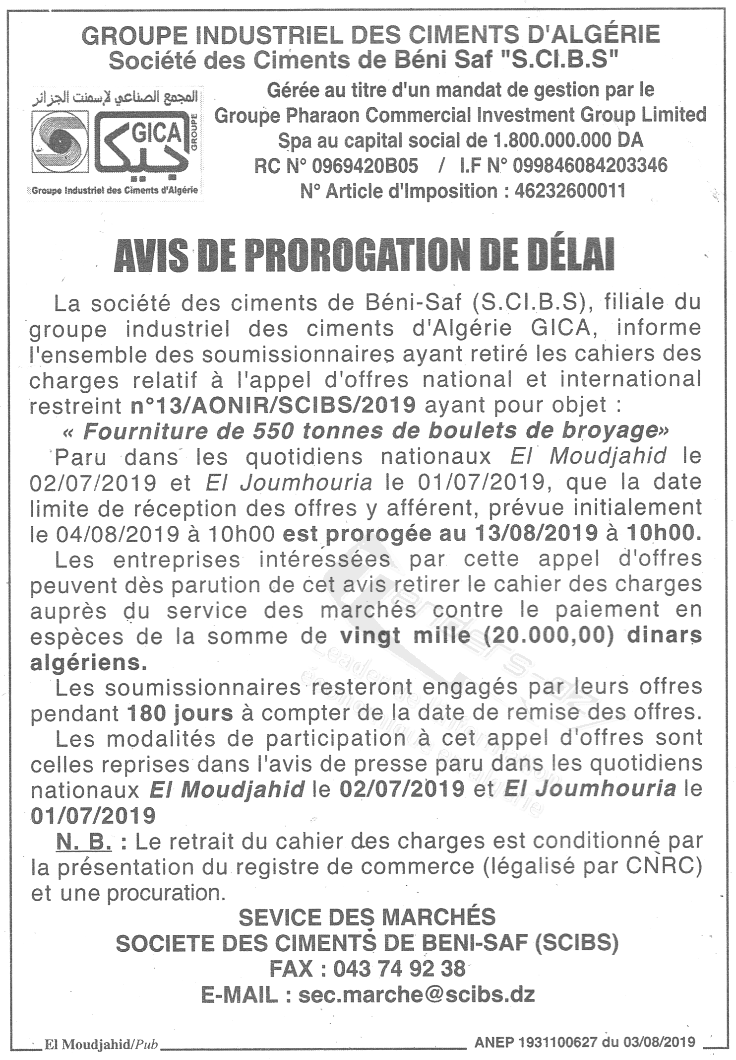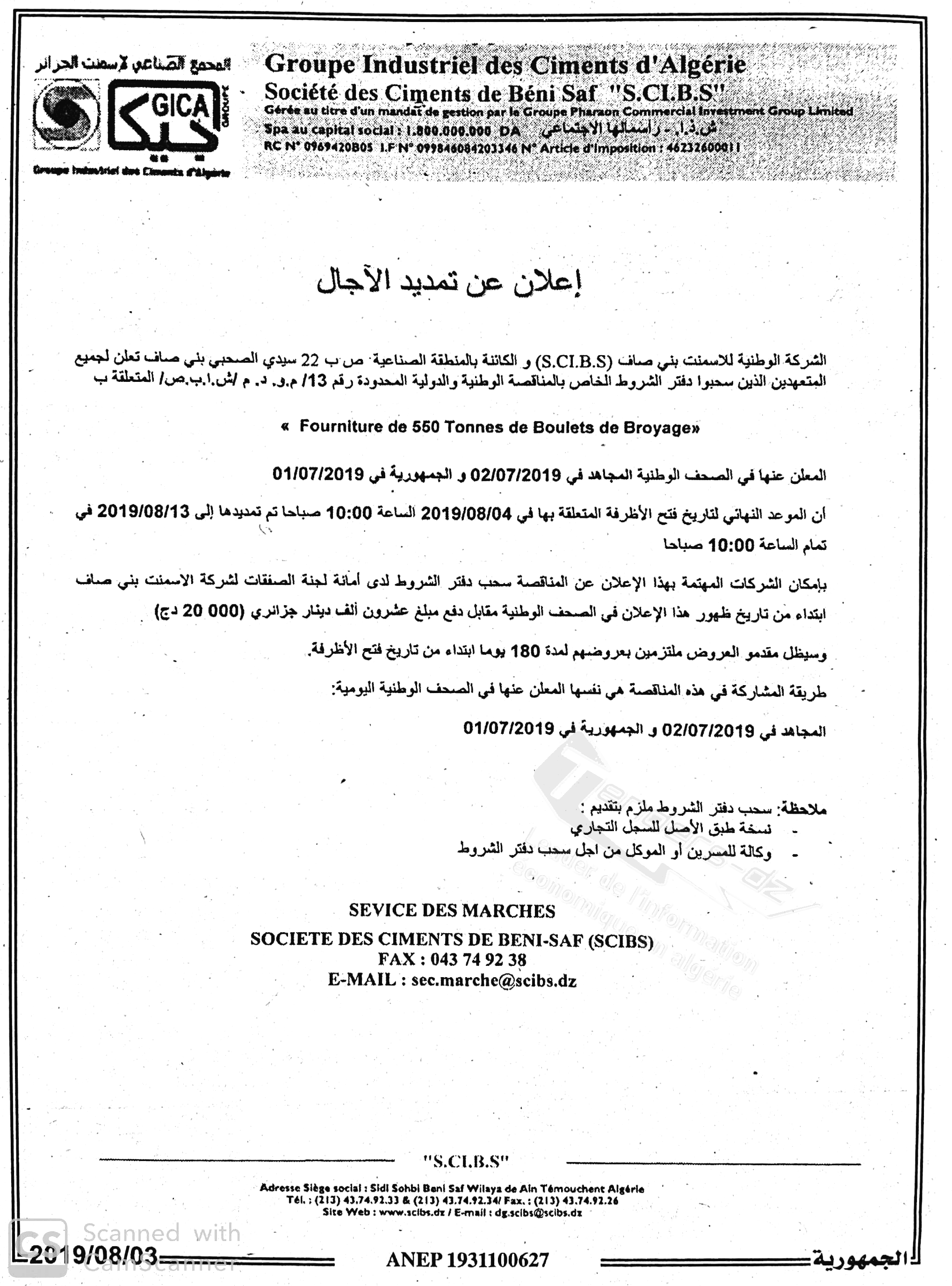 | PROROGATION DE DELAI : Fourniture de 550 Tn de Boulets pour Broyages (Expiré) |