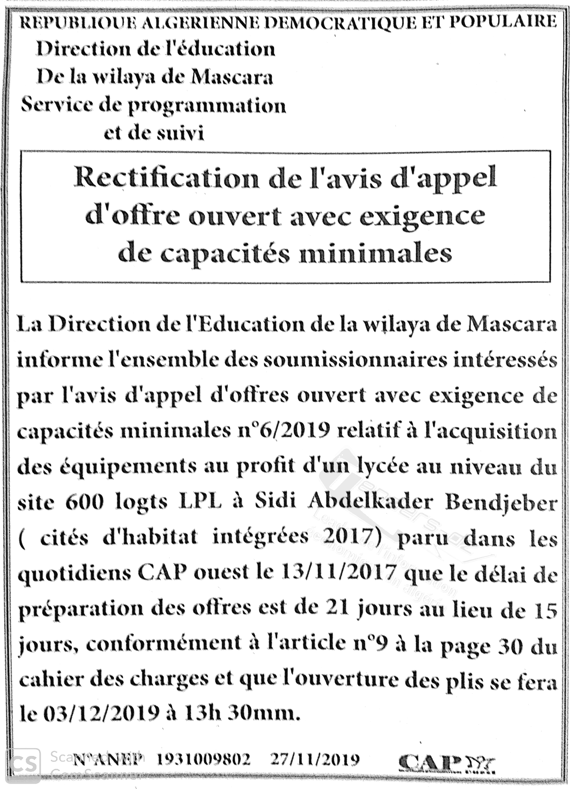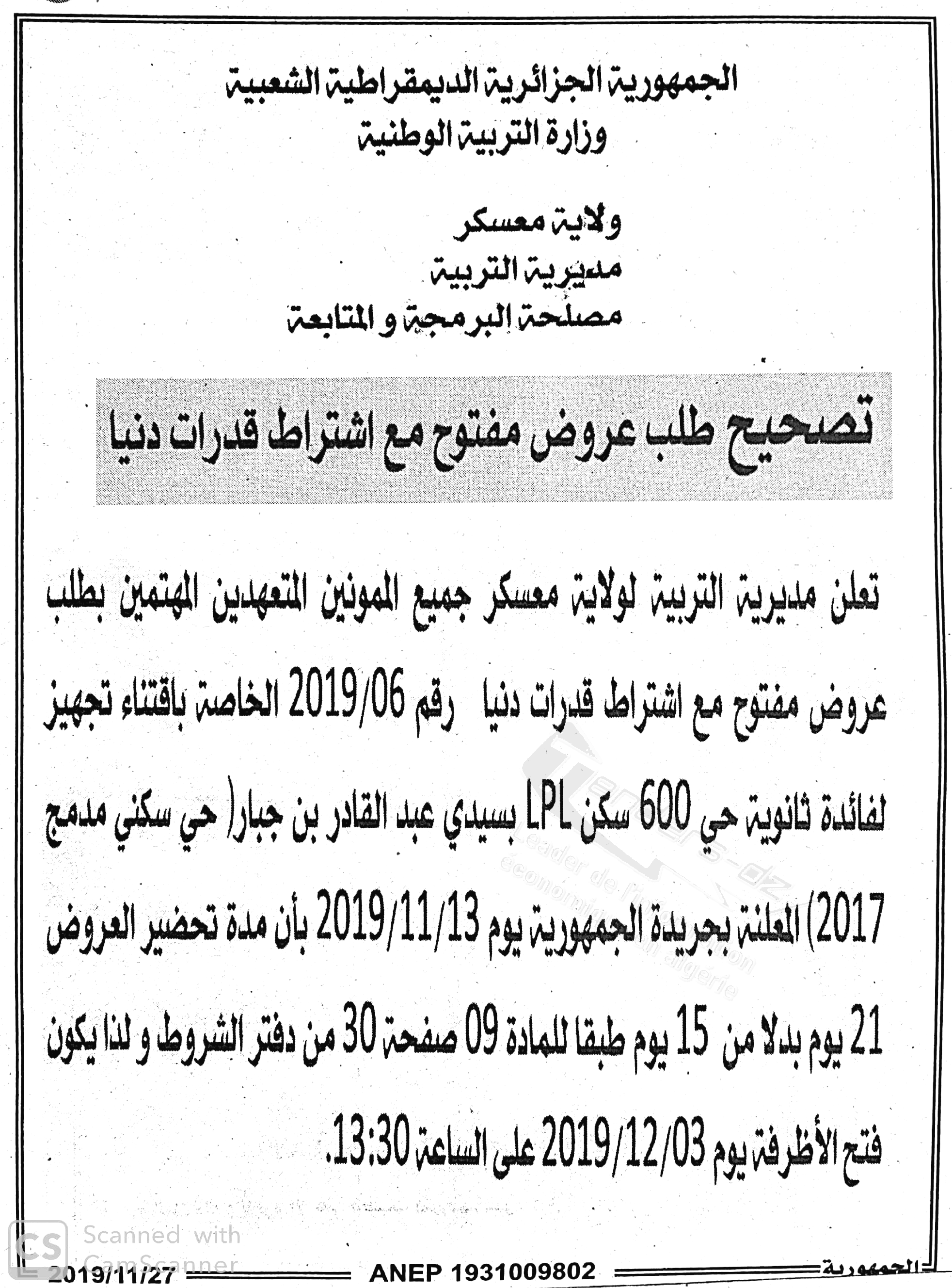 Nom Organisme : DIRECTION DE L'EDUCATION WILAYA DE MASCARA