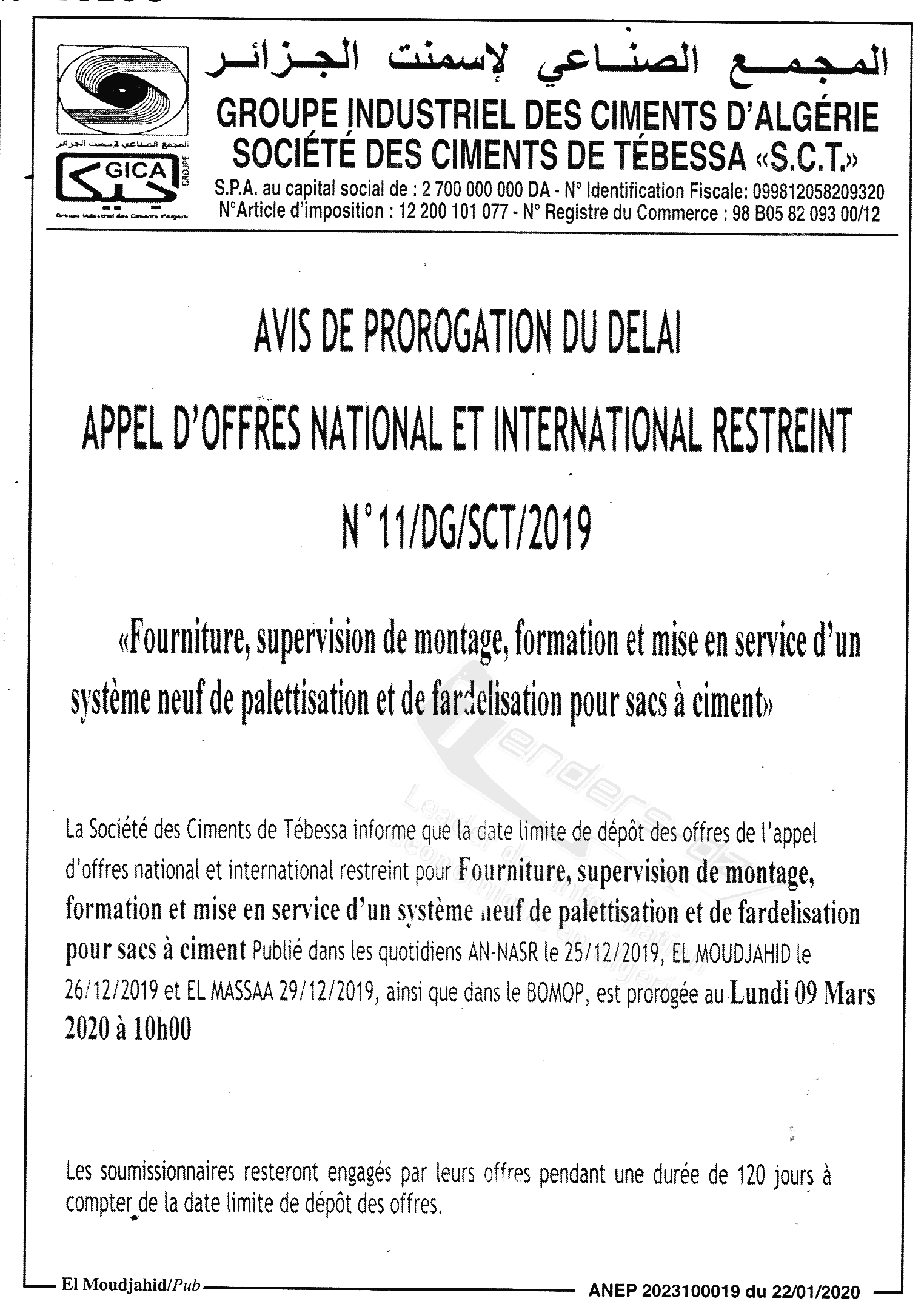 Objet : Fourniture, supervision, formation et mise en service d'un système neuf de palettisation de fardelisation pour sacs à ciments