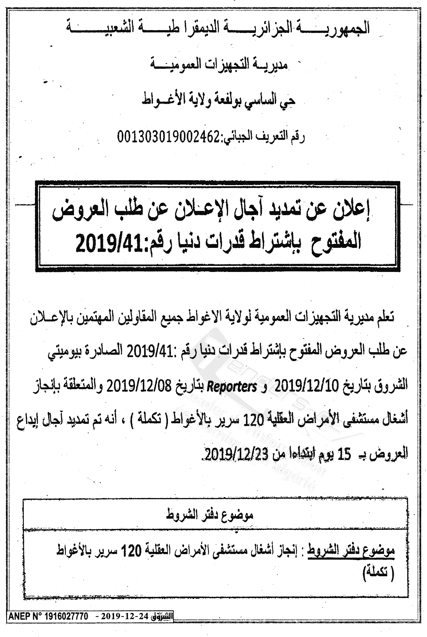 Nom Organisme : DEP WILAYA DE LAGHOUAT (DIRECTION DES EQUIPEMENTS PUBLICS)