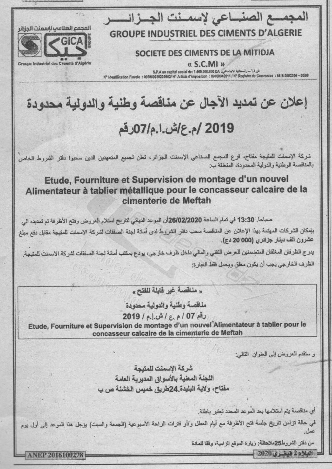 AVIS Annulation :  Etude, fourniture et supervision de montage d'un nouvel alimentateur à tablier métallique pour le concasseur calcaire de la cimenterie de Meftah