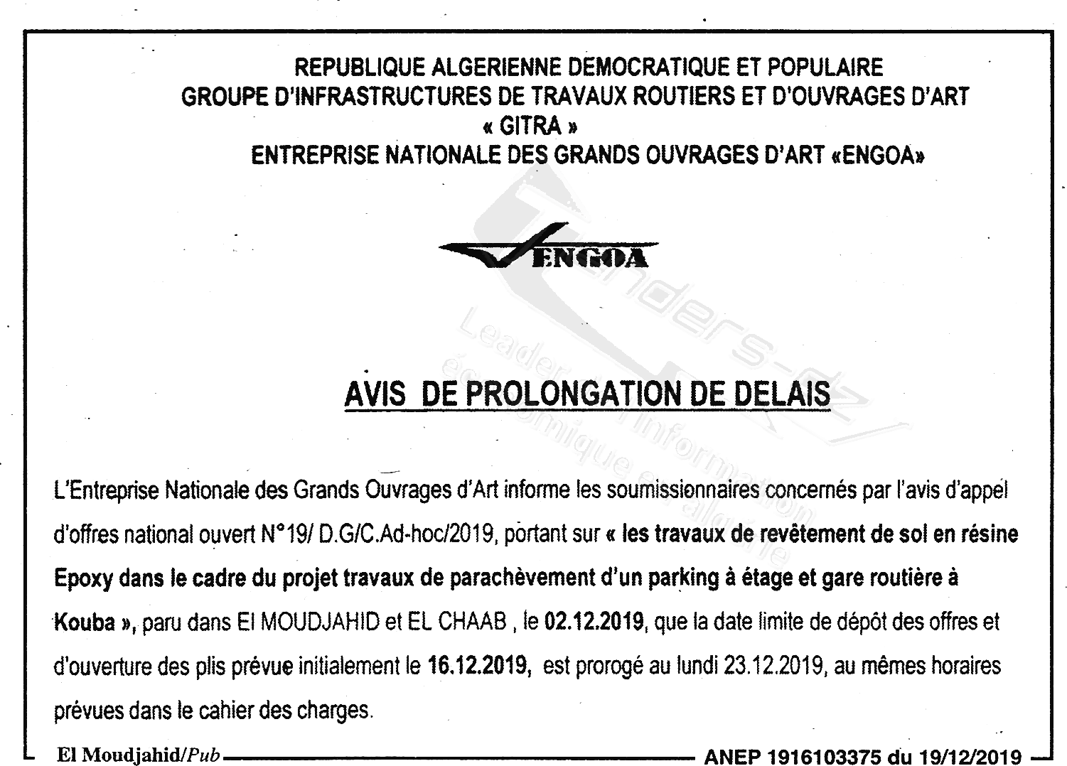 | Montant de Retrait du Cahier de Charges : 10 000,00 DA |