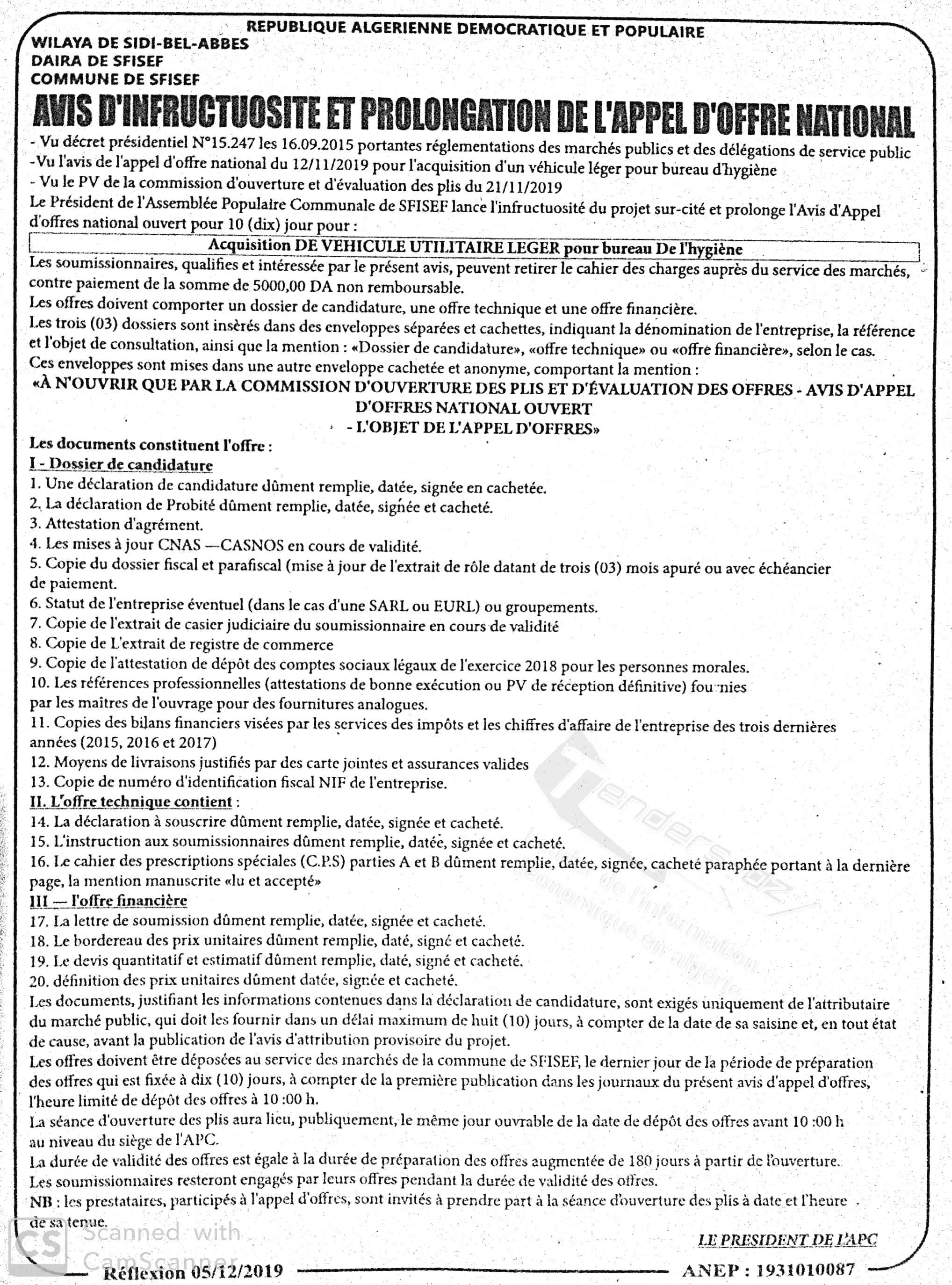 | Montant de Retrait du Cahier de Charges : 5000.00 DA |