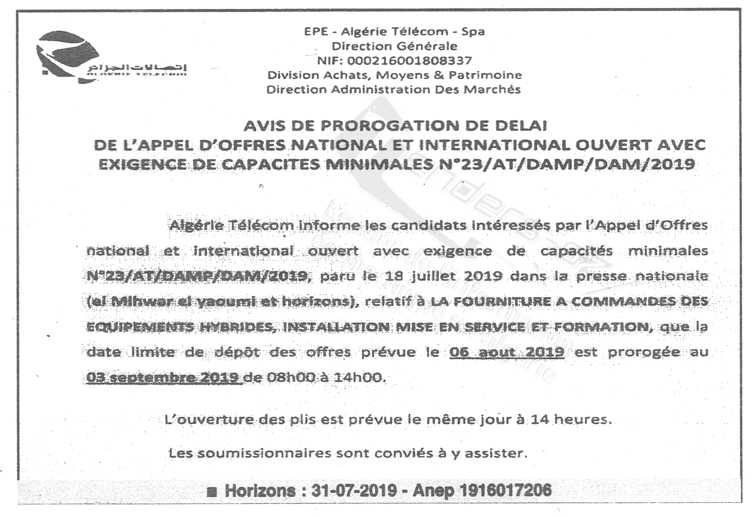 | Montant de Retrait du Cahier de Charges : 10.000 DA |