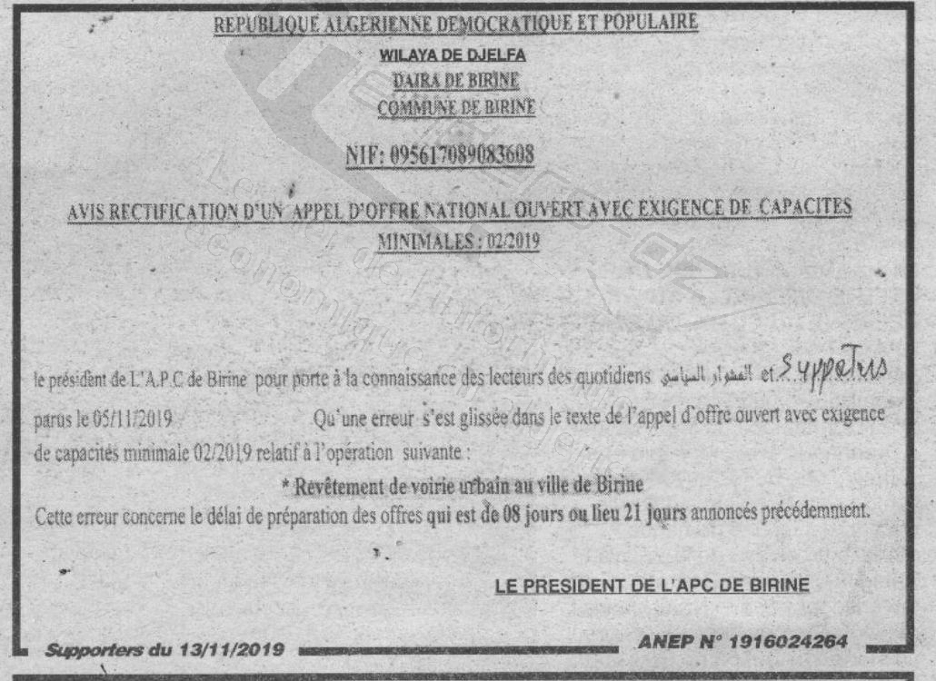 | AVIS Annulation : Revêtement de la route urbaine de la ville Birine |