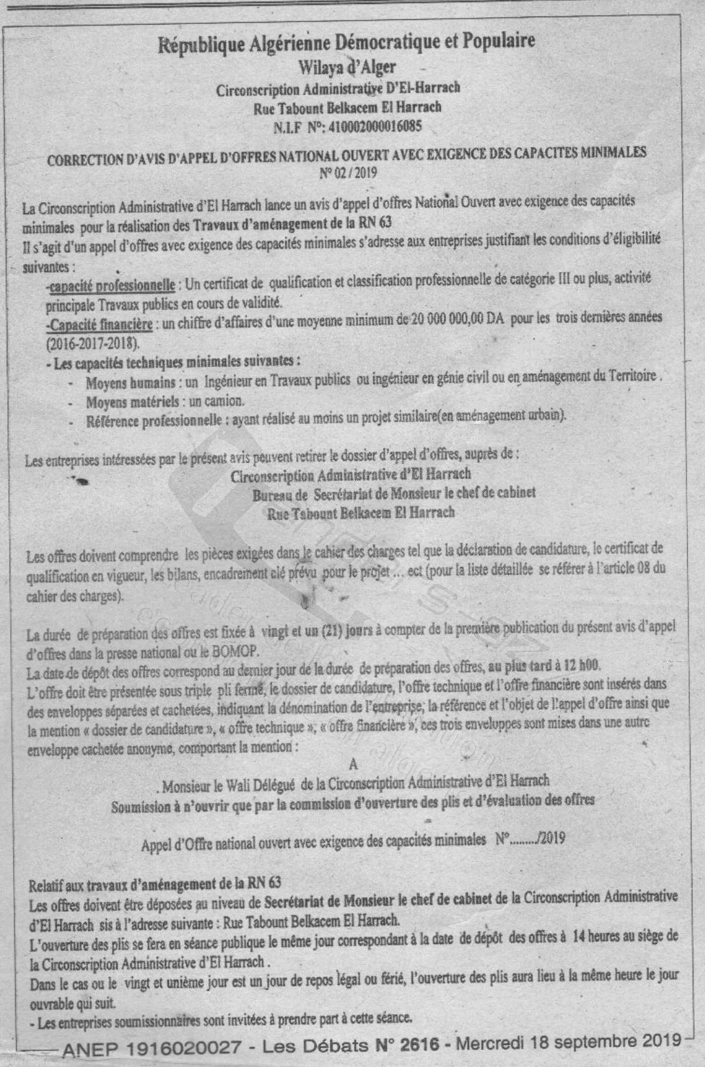 APPEL D'OFFRES NATIONAL OUVERT