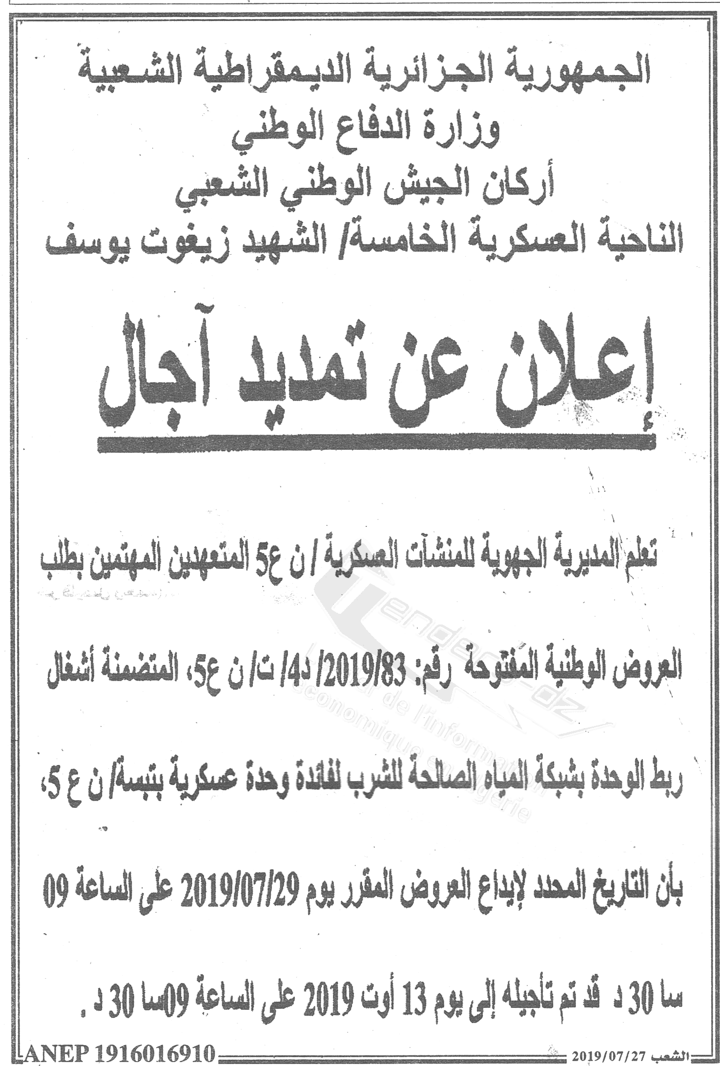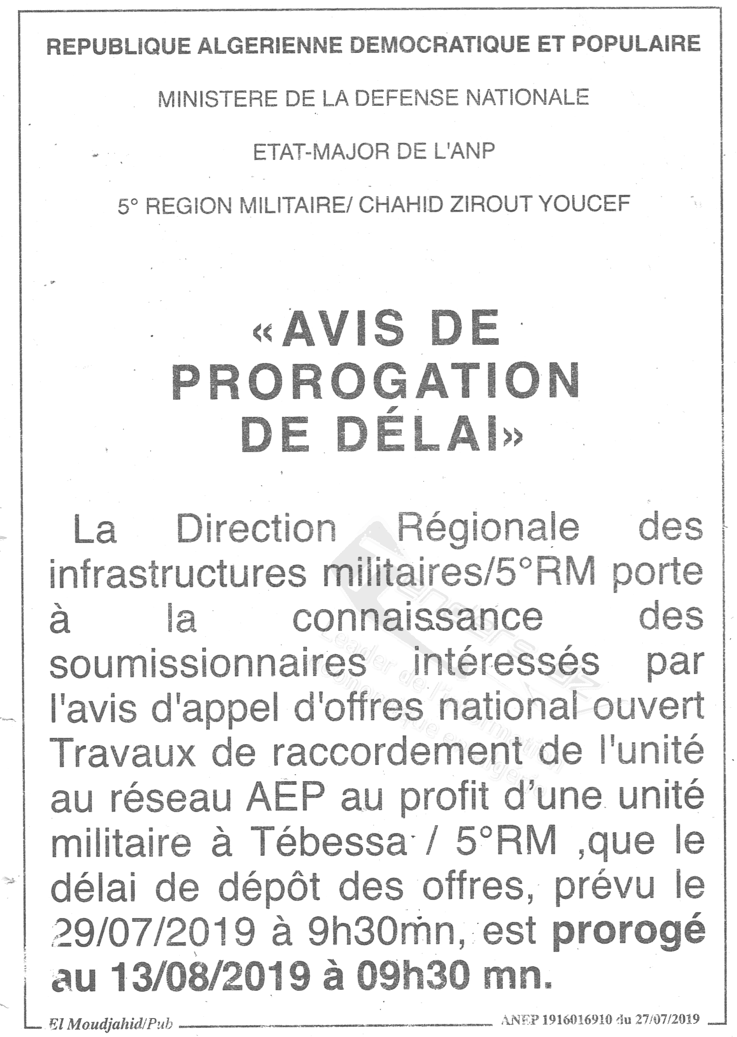 | Montant de Retrait du Cahier de Charges : 10.000 DA |