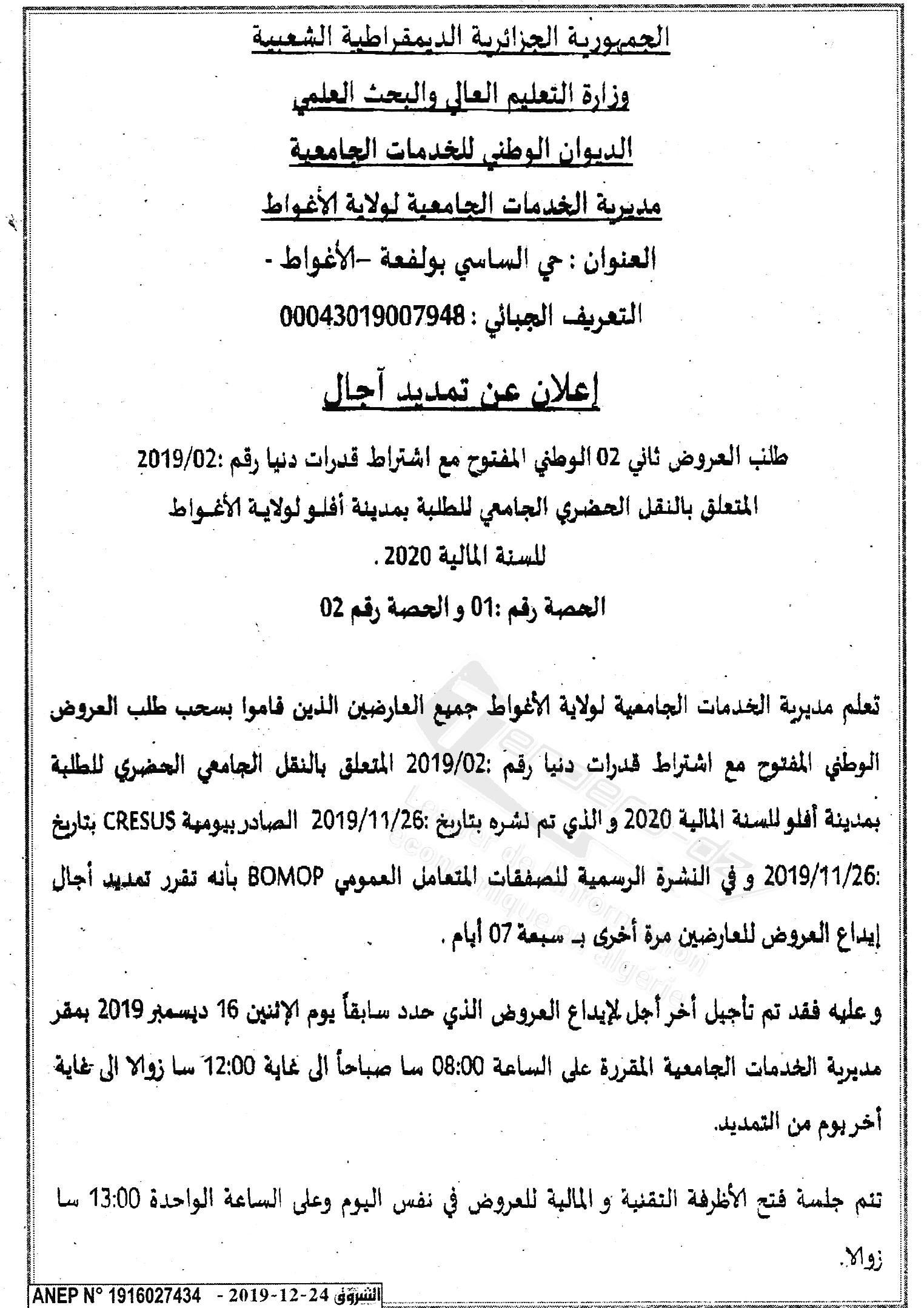 AVIS Attribution :  Transport des étudiants durant l'année 2020 ville de Aflou en mode urbain en 02 lots