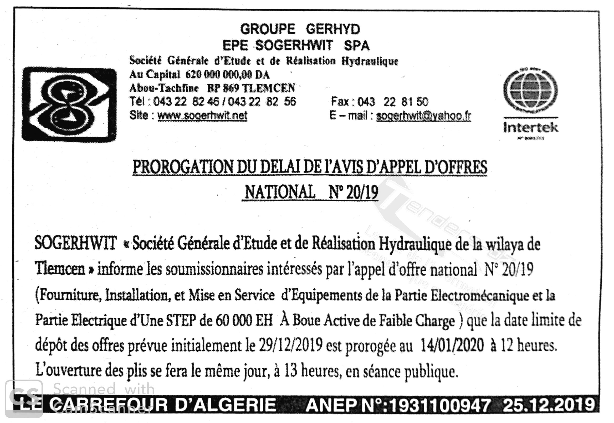 | Montant de Retrait du Cahier de Charges : 5000.00 DA |