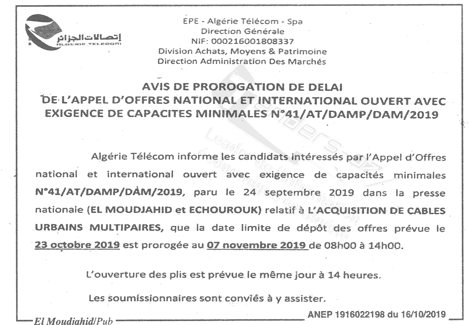 | Montant de Retrait du Cahier de Charges : 10 000 DA |