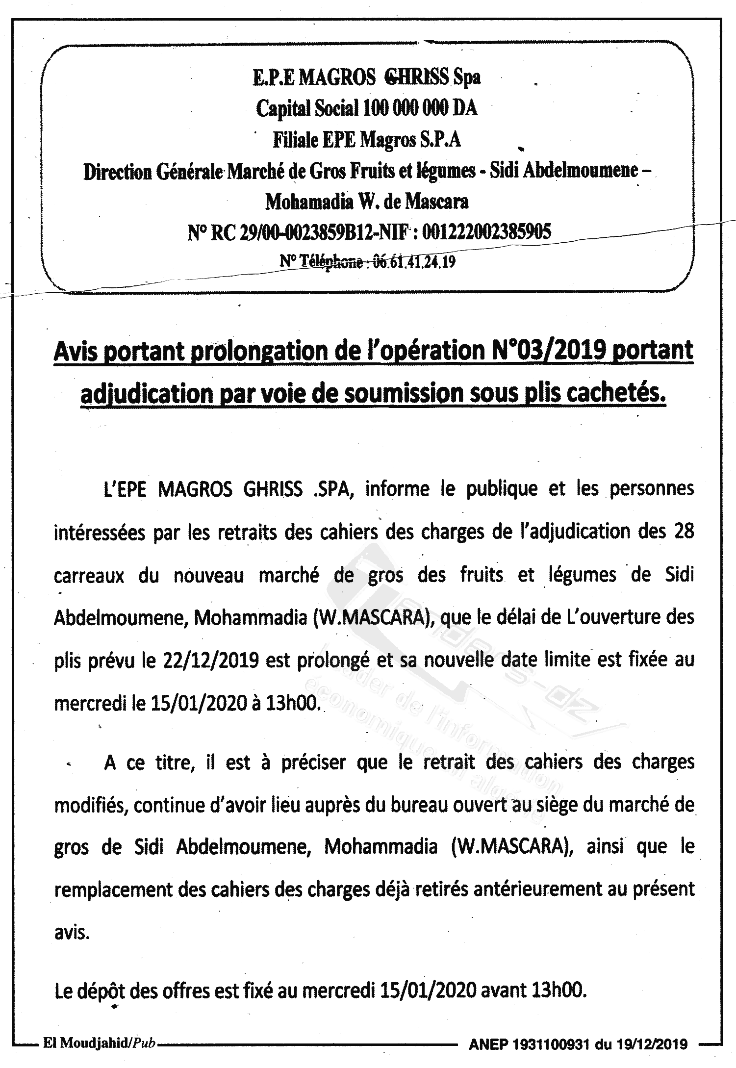 Objet : Location des carreaux destiné à l'activité de mandataire et grossiste en fruits et légumes au sein du niveau marché de gros de Sidi Abdemoumen El Mohammedia wilaya de Mascara