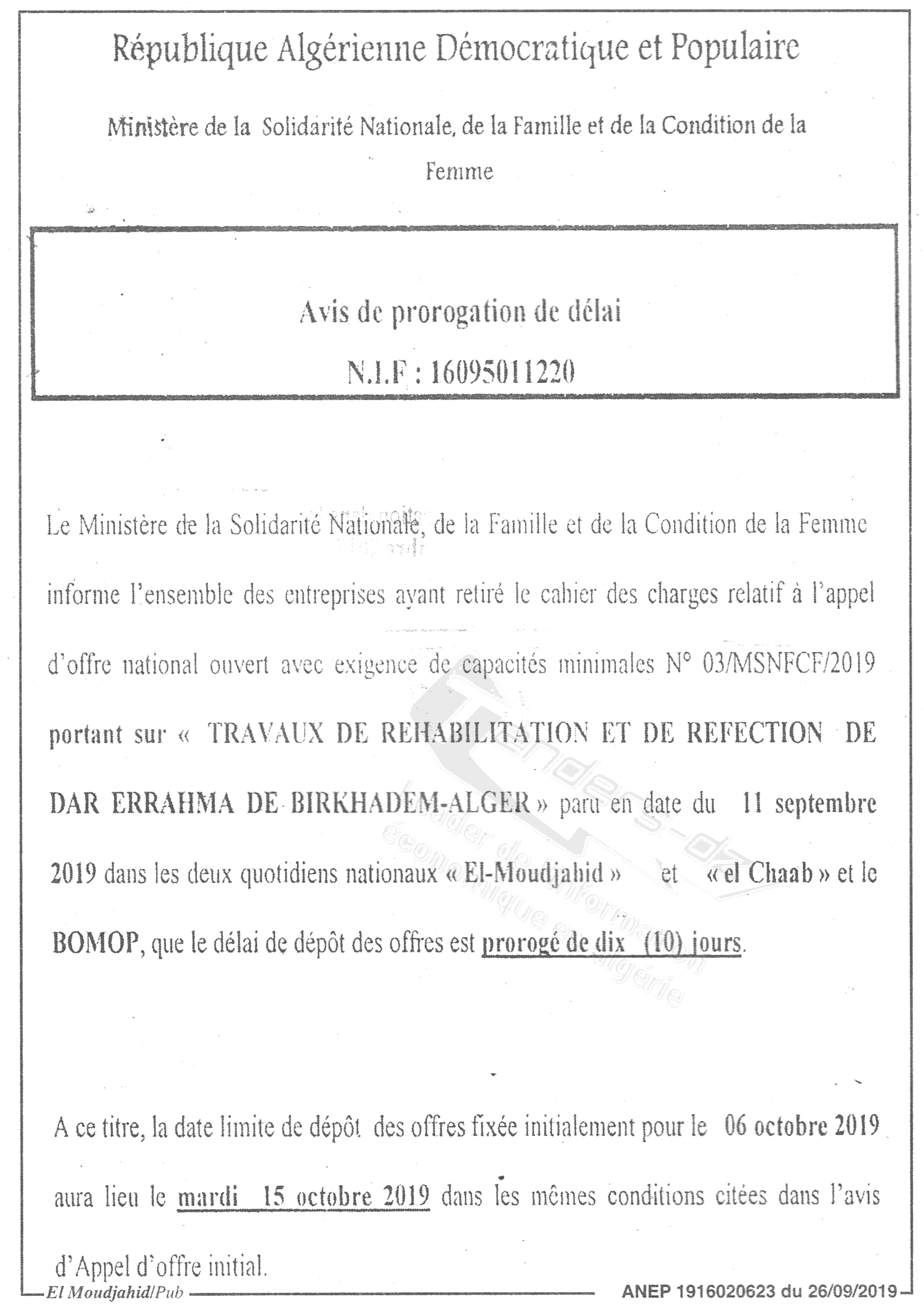 Objet : Travaux de réhabilitation et de réfection de Dar Errahma de Bir Khadem à Alger