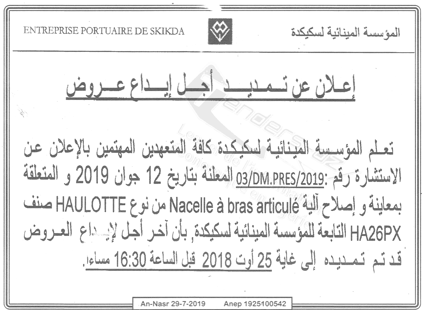 Objet : Réalisation du diagnostic , réparation , fourniture de PDR nécessaire pour la remise en service de la nacelle à bras articule de marque Haulotte type HA26PX de l'entreprise portuaire de Skikda