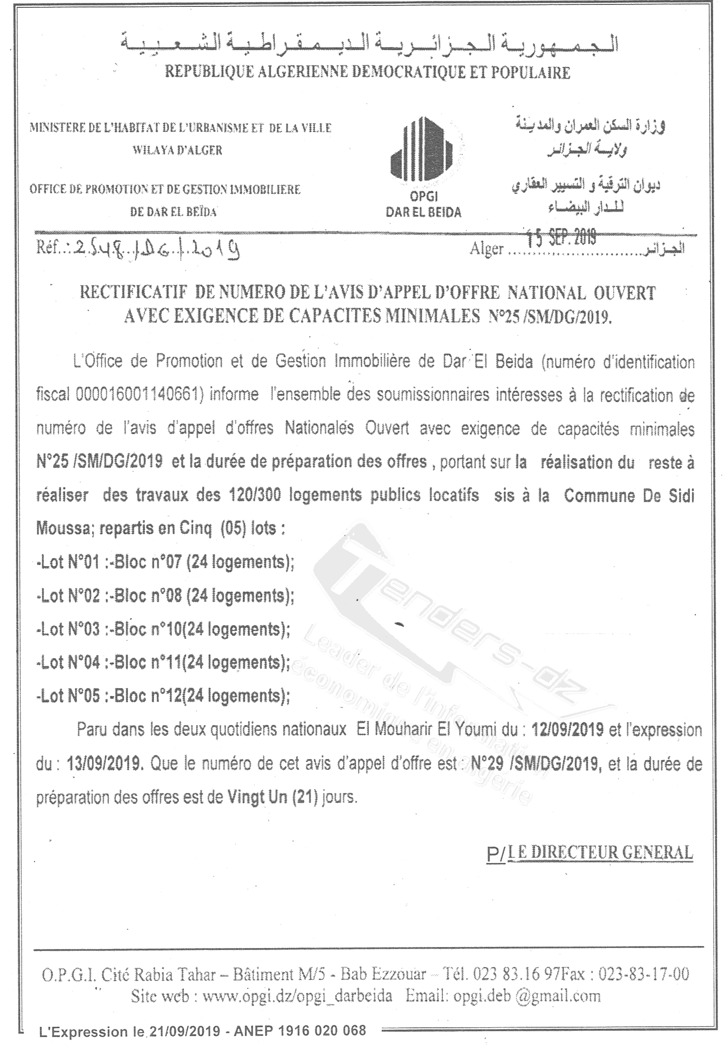 Nom Organisme : OPGI DE DAR EL BEIDA (OFFICE DE PROMOTION ET DE GESTION IMMOBILIAIRE)