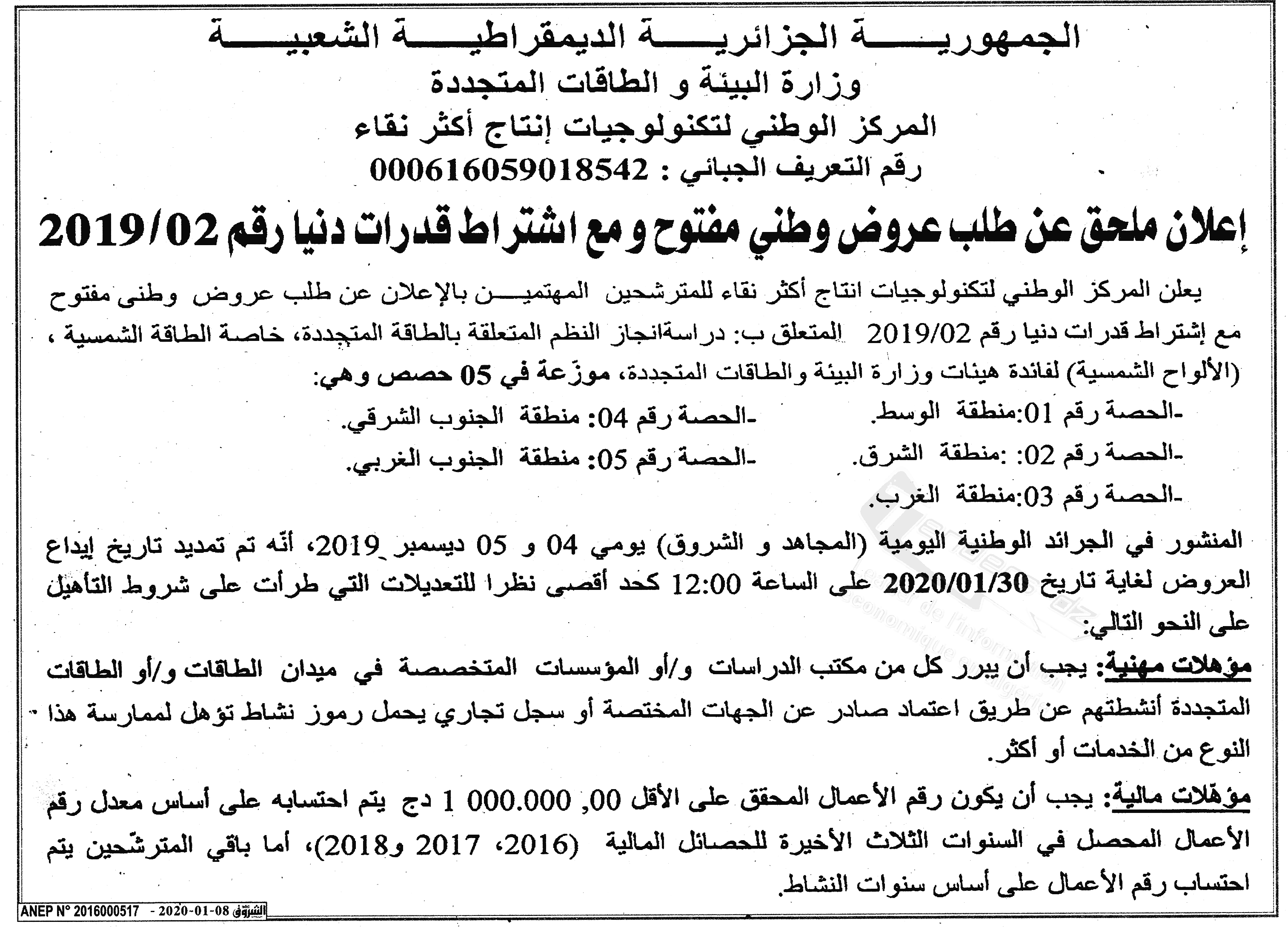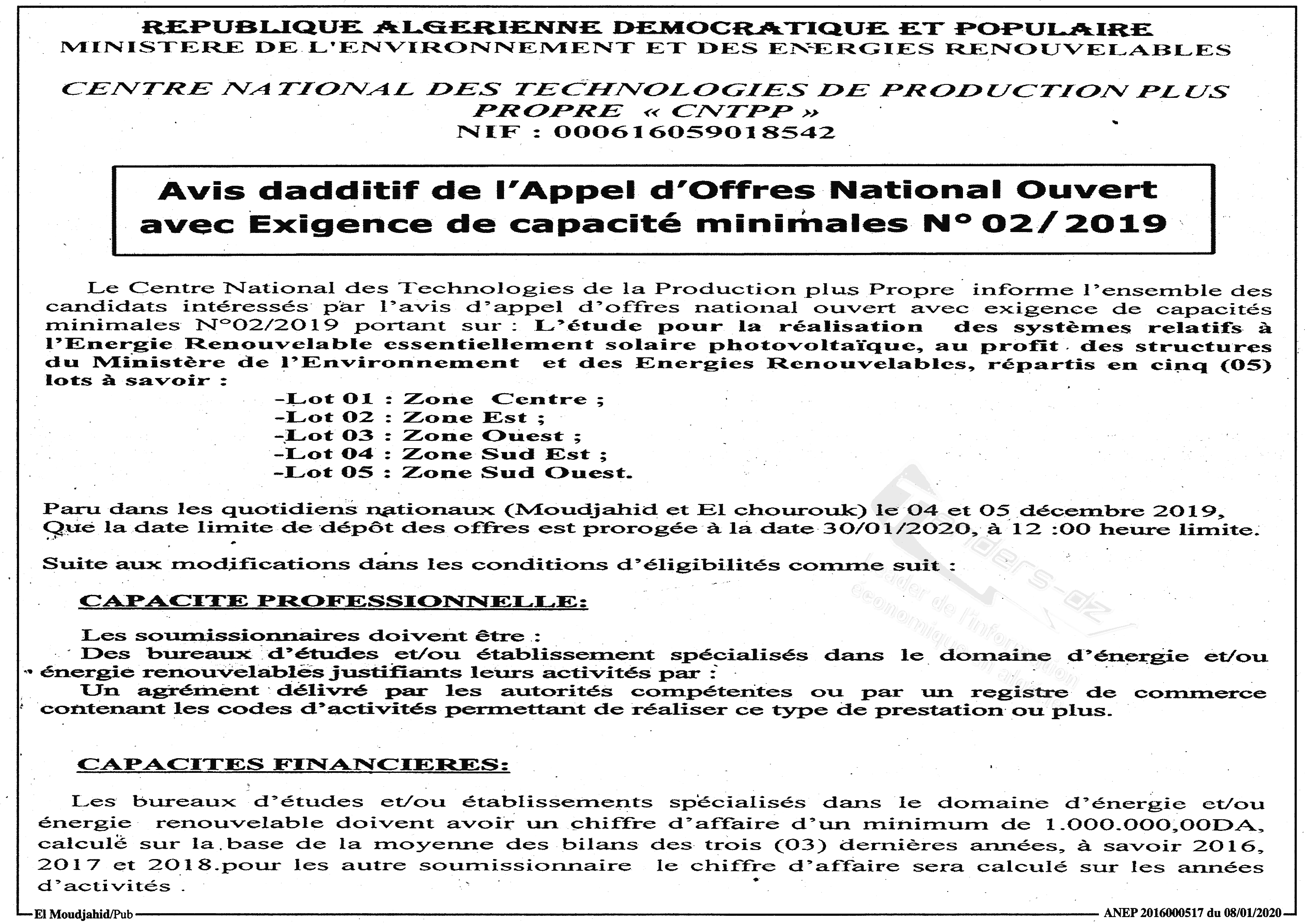 Objet : Etude de réalisation d'un système de l'énergie renouvelable essentiellement solaire photovoltaïque en 05 lots