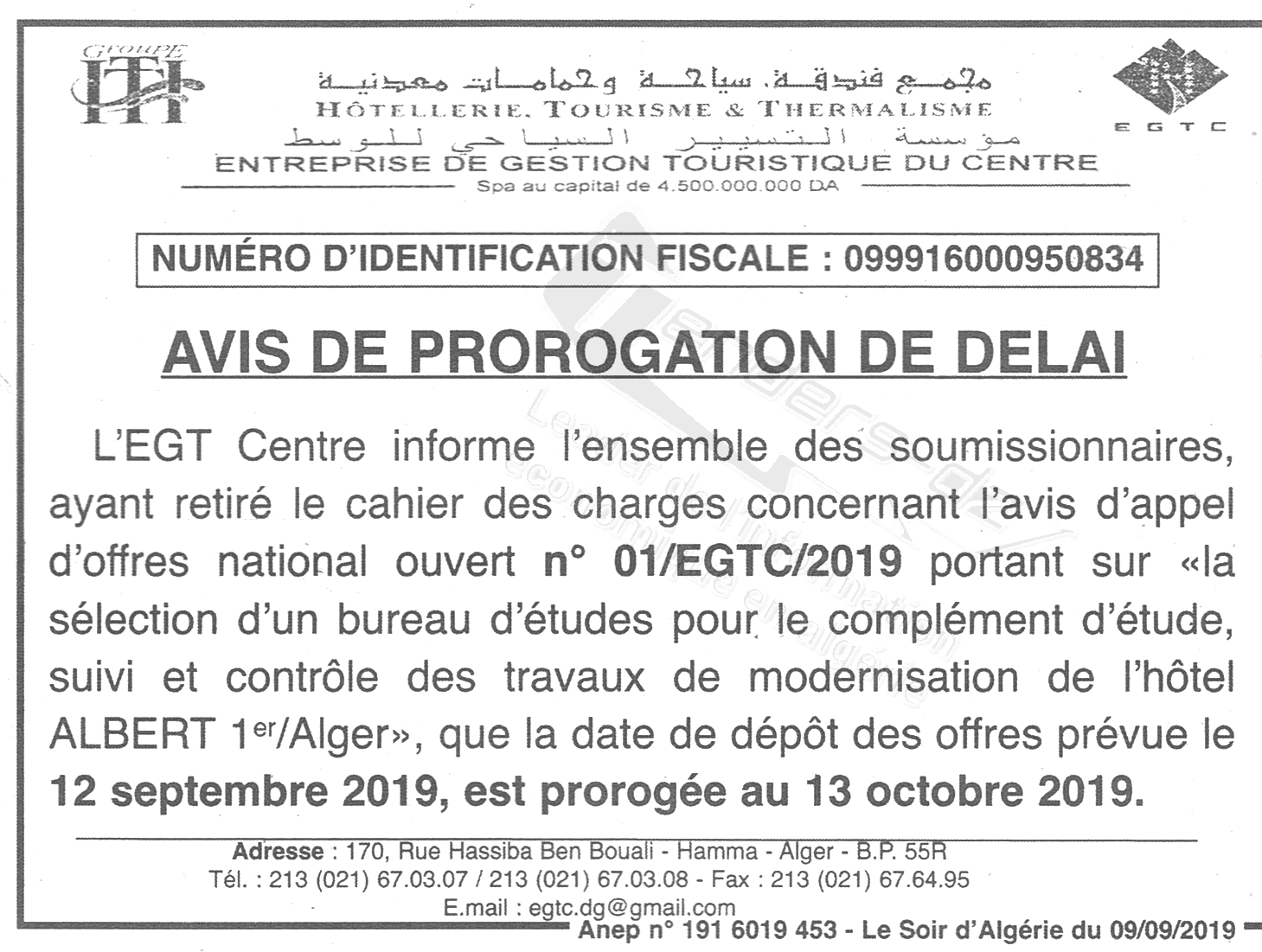 Objet : Etude, suivi et contrôle des travaux de modernisation de l'Hotel ALBERT à Alger