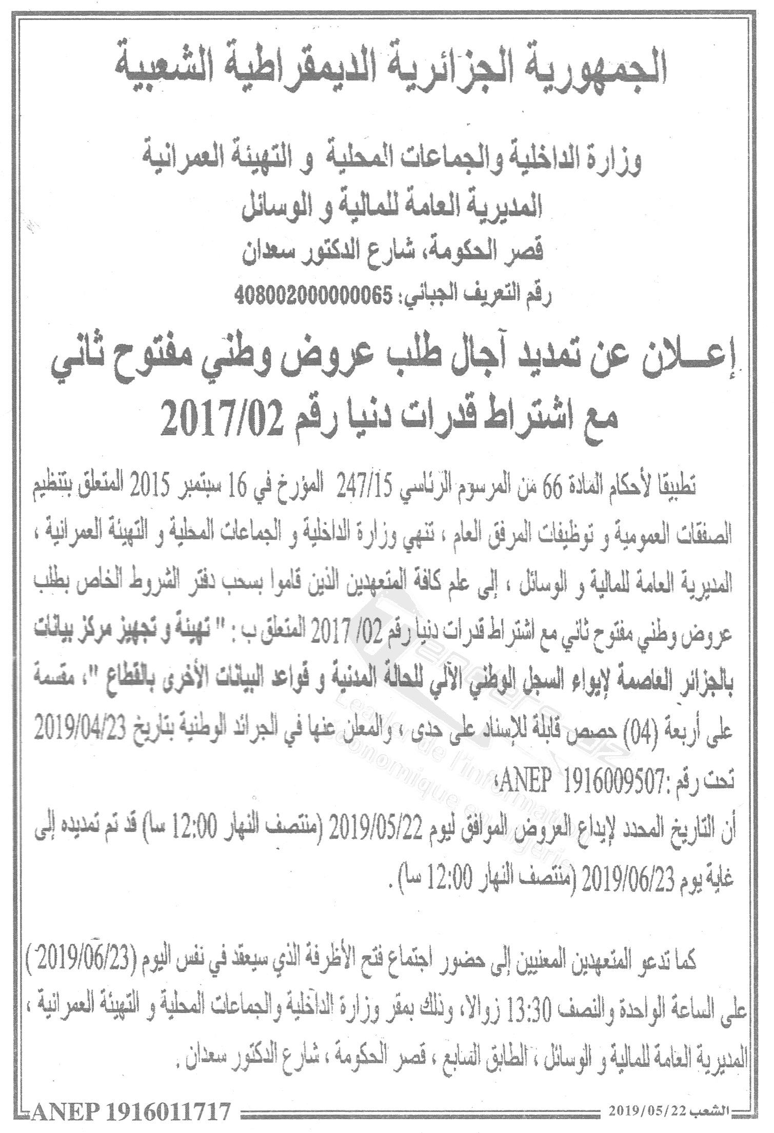 AVIS Attribution :  Aménagement et équipement d'un DATA center Sis à Alger pour l'hébergement du registre national automatisé de l'état civil et des autres bases de données de secteur répartis en quatre Lots