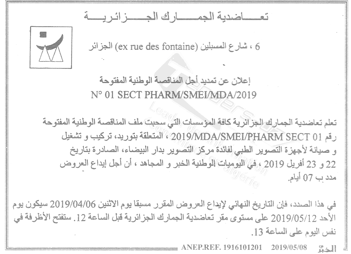 Objet : L'acquisition, pre installation, installation mise en marche et maintenance des équipements d'imagerie médicale, au profit du centre médico-social de Dar El Beida Alger, en six lots séparés