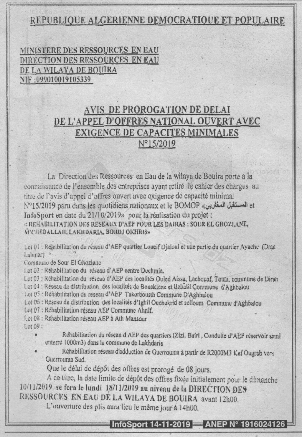 Objet : Réhabilitation de réseau d'eau potable des Dairas ; Sour El Ghozelene, Amechdala, Lakharia et Bordj Akhriss en lots séparés