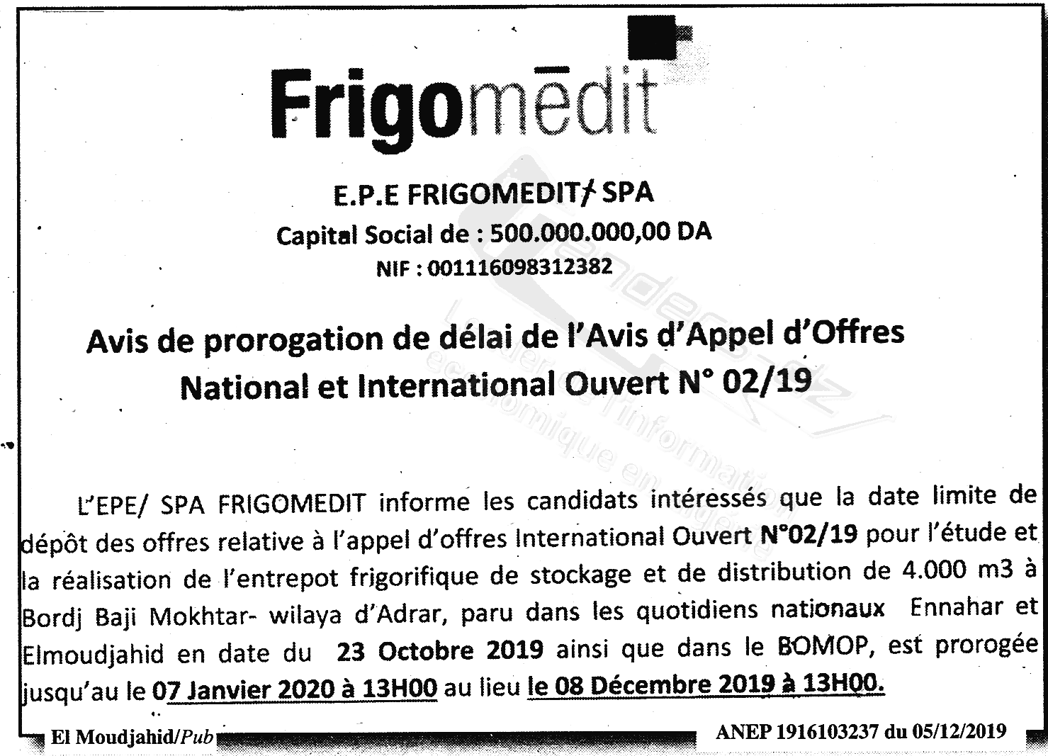 Objet : Etude et réalisation d'un complexe frigorifique de stockage et distribution de 400 m3 à Bordj Badji mokhtar wilaya d'Adrar
